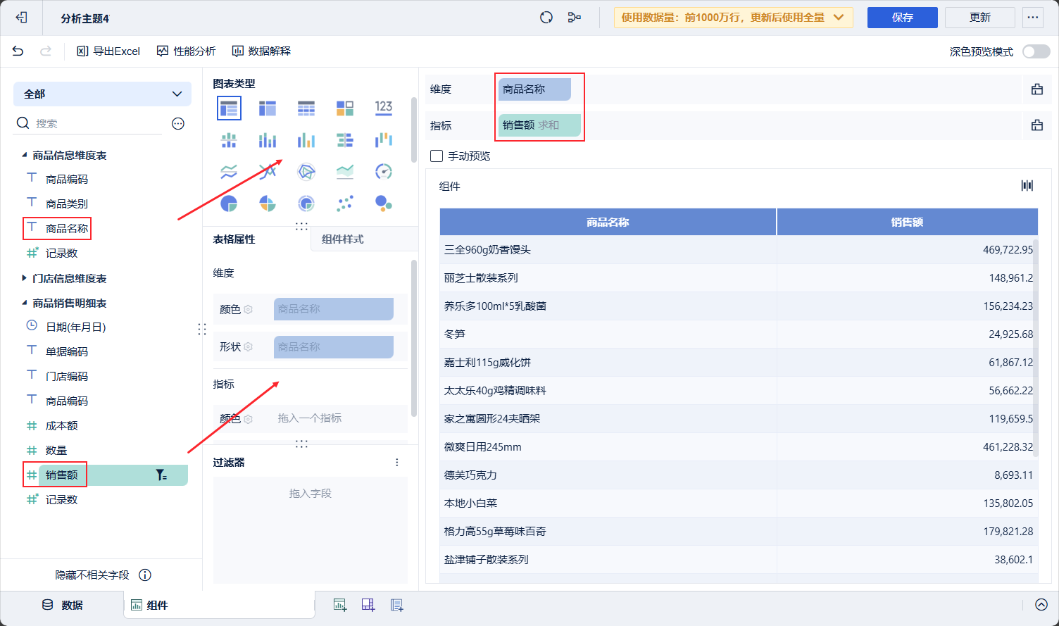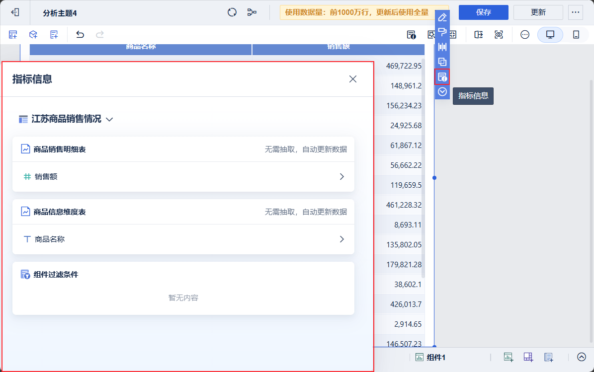 在之前的组件分析中已对销售额设置了指标条件,筛选出江苏的数据,操作会保留在主题模型内,下次分析可直接使用。