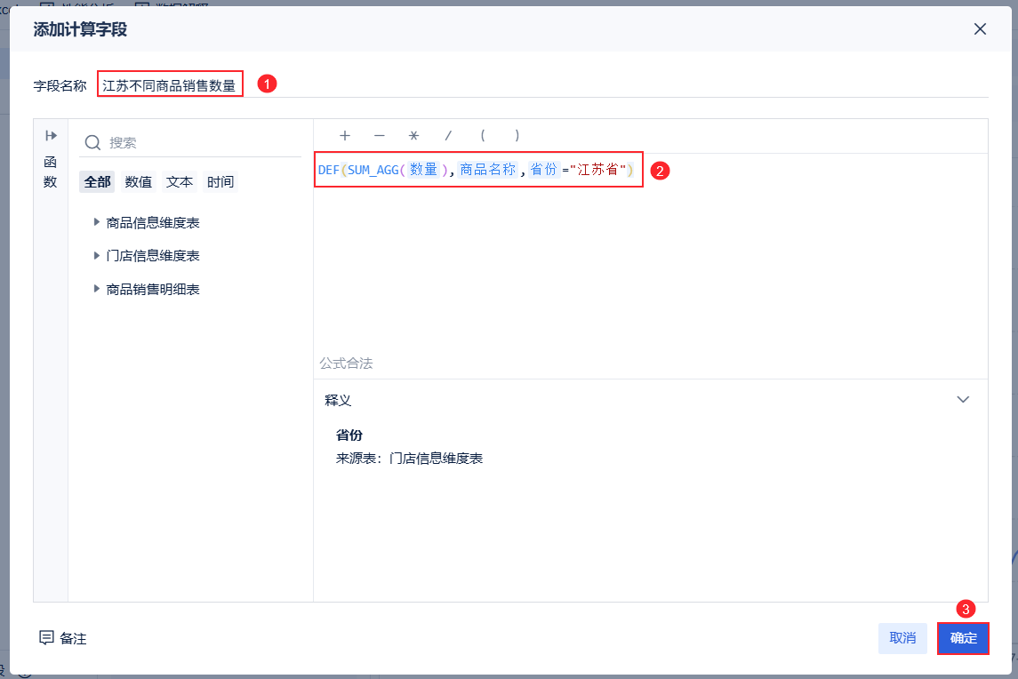 先对商品销售明细表的「销售额」字段添加「指标条件」,选择门店信息维度表的「省份」字段,过滤出江苏的数据。如下图所示: