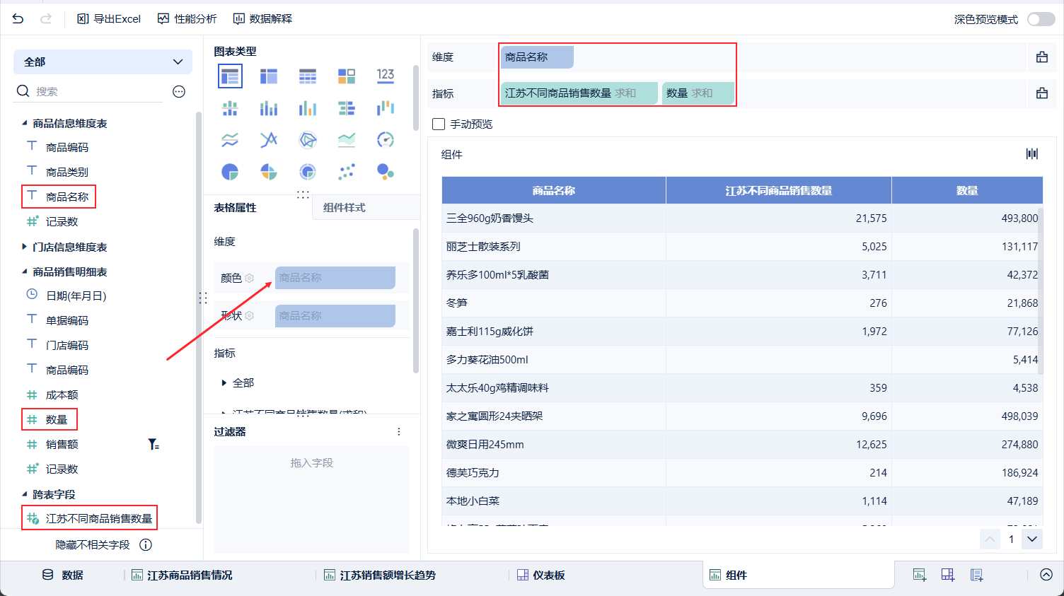例如,使用计算字段求江苏的不同商品销售数量分析。如下图所示: