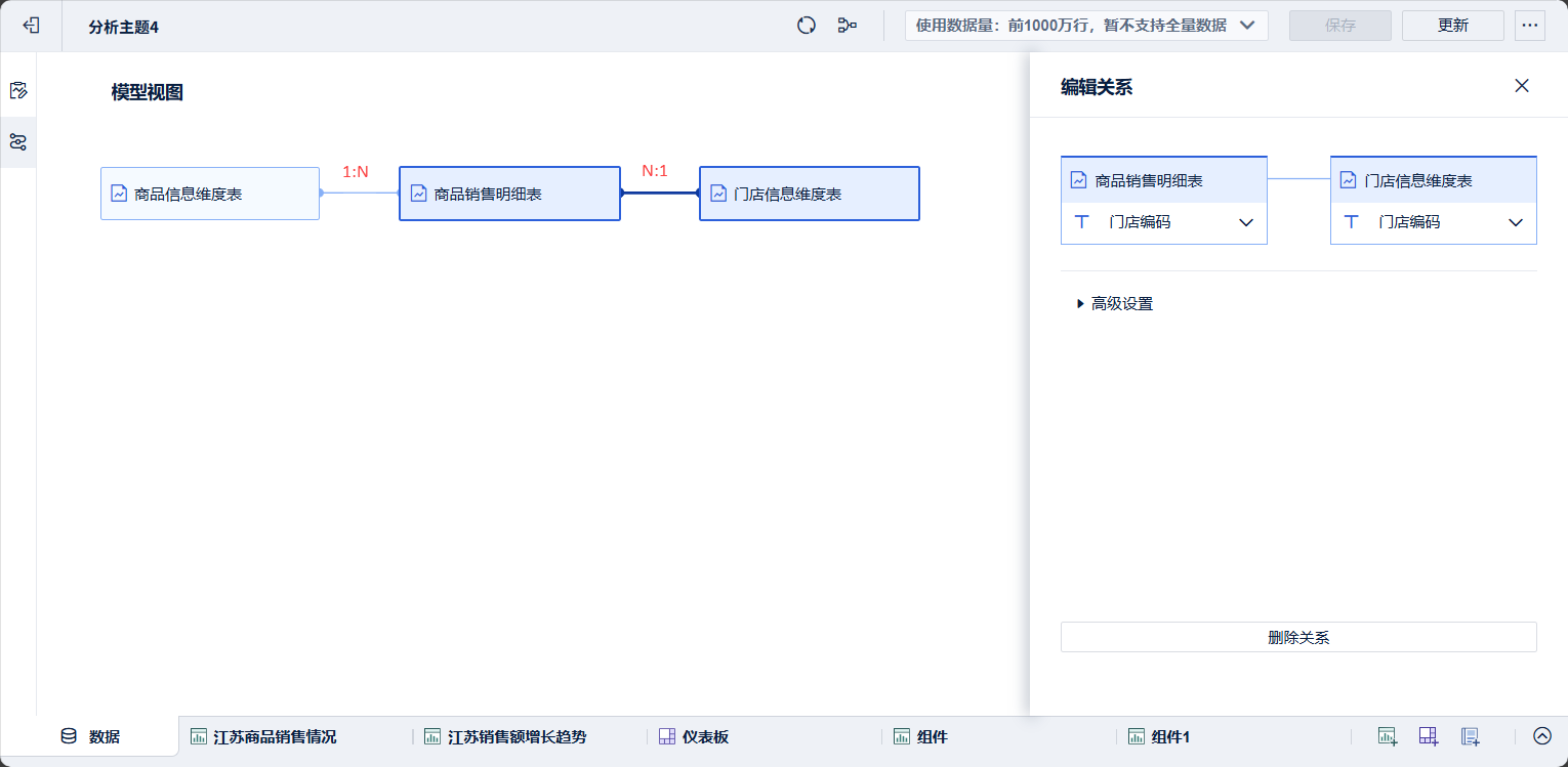 只需要将分析主题内的表在模型中建立关联,就能使用多张表一起分析。