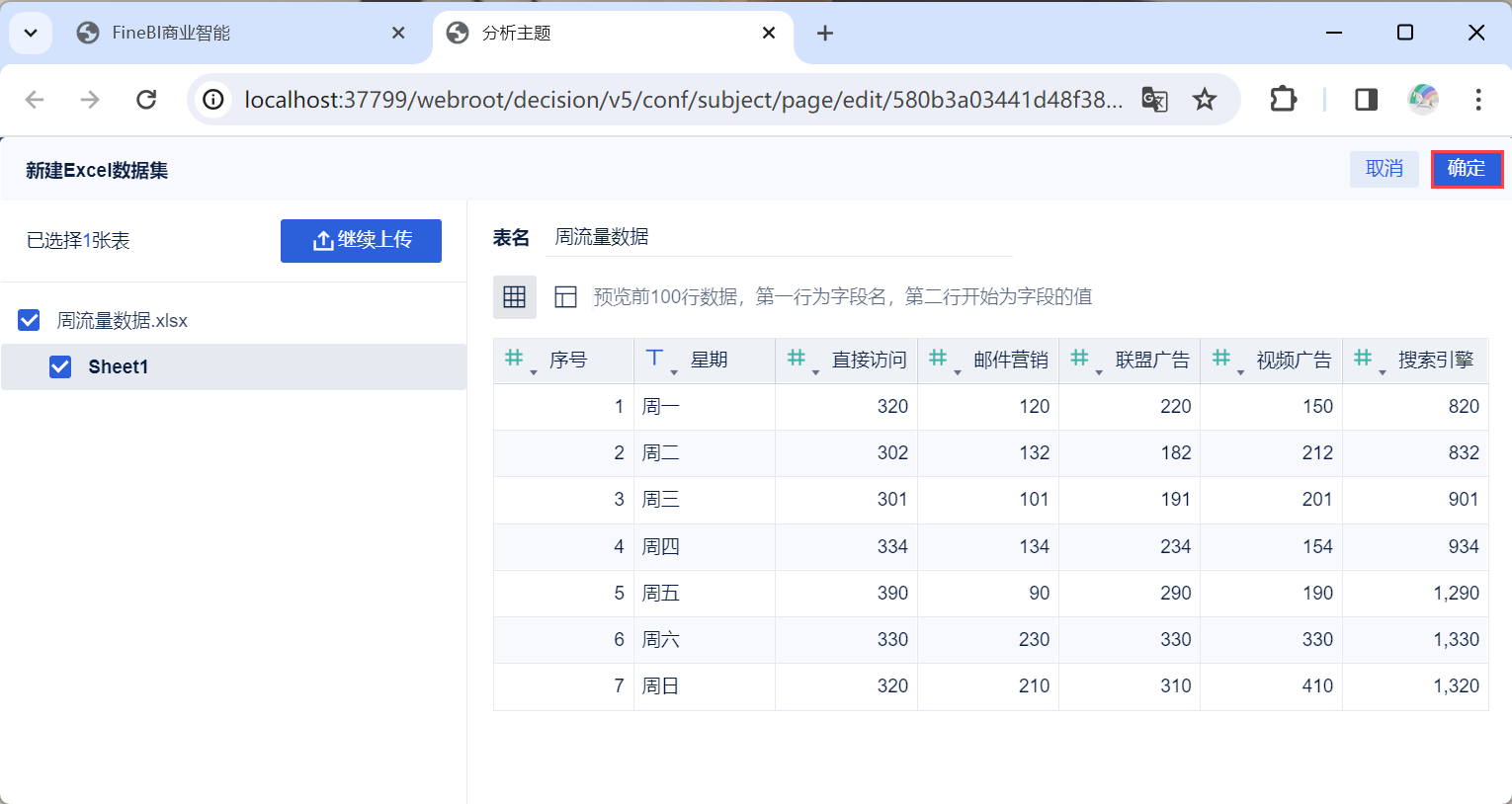 2)点击「本地Excel文件>上传数据」,上传表数据。如下图所示: