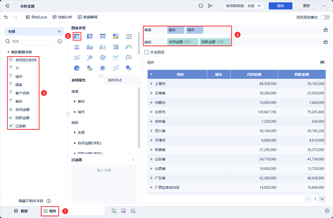 3)将待分析区域的「省份」「城市」拖入维度栏;「合同金额」「回款金额」拖入指标栏,如下图所示: