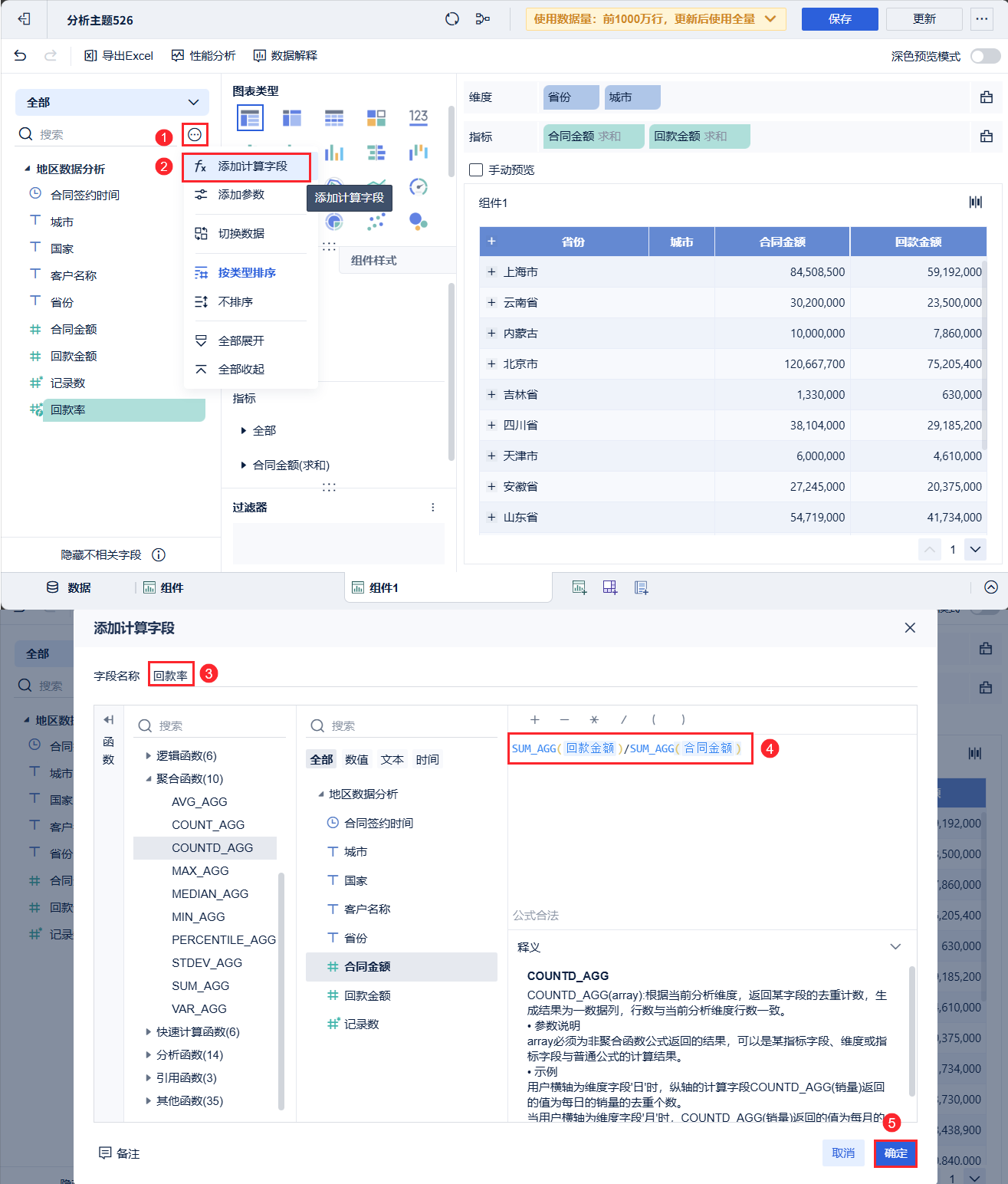 3)添加「回款率」计算公式:SUM_AGG(回款金额)/SUM_AGG(合同金额)