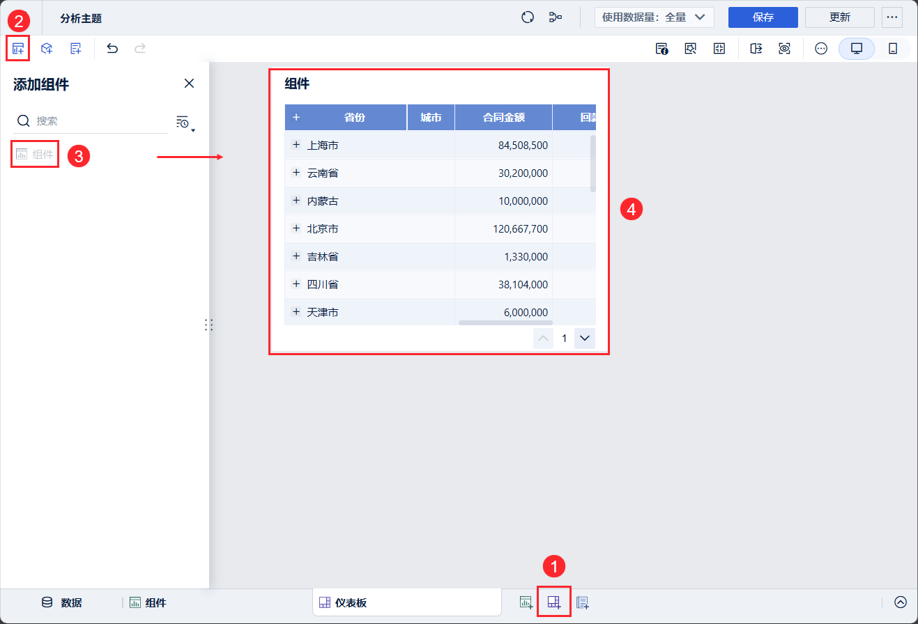 2)进入仪表板编辑界面,将分组表组件拖入至仪表板中。