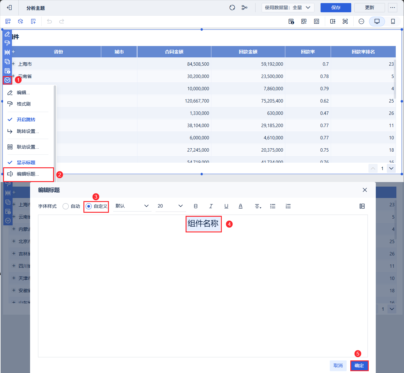 3)下拉选择「编辑标题」,样式选择「自定义」,设置标题为「分组表」,点击「确定」。如下图所示: