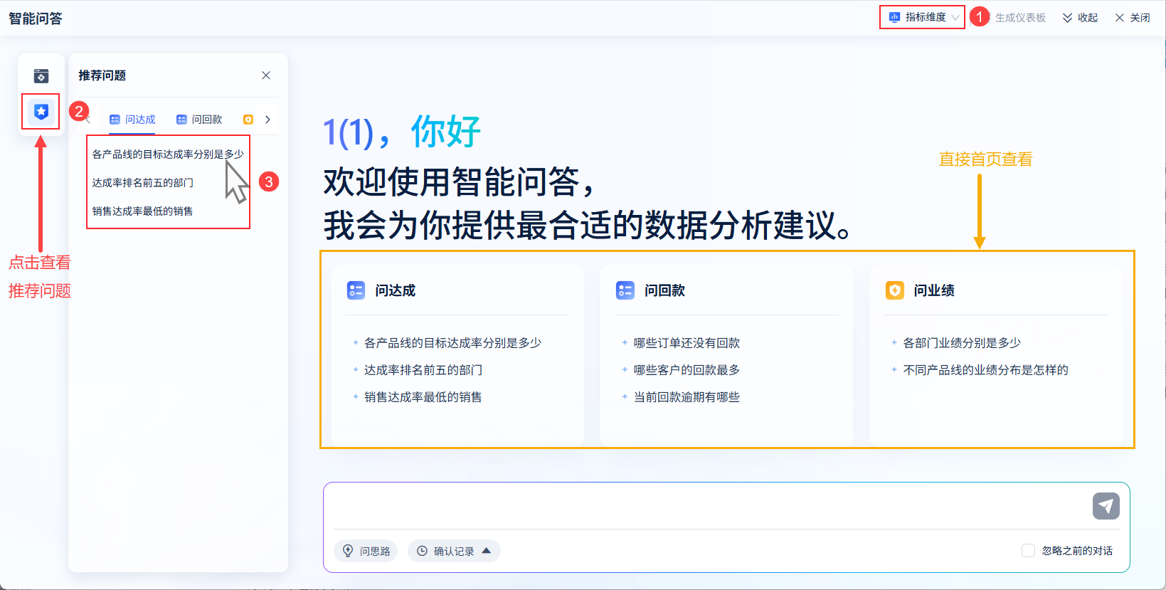 例如:管理员在了解业务常问问题后,配置了「问达成、问回款、问业绩」三类推荐问题,方便业务用户快速点击问题获得答案。