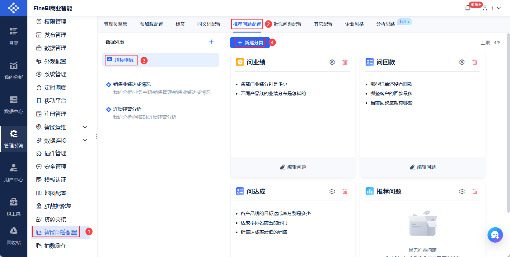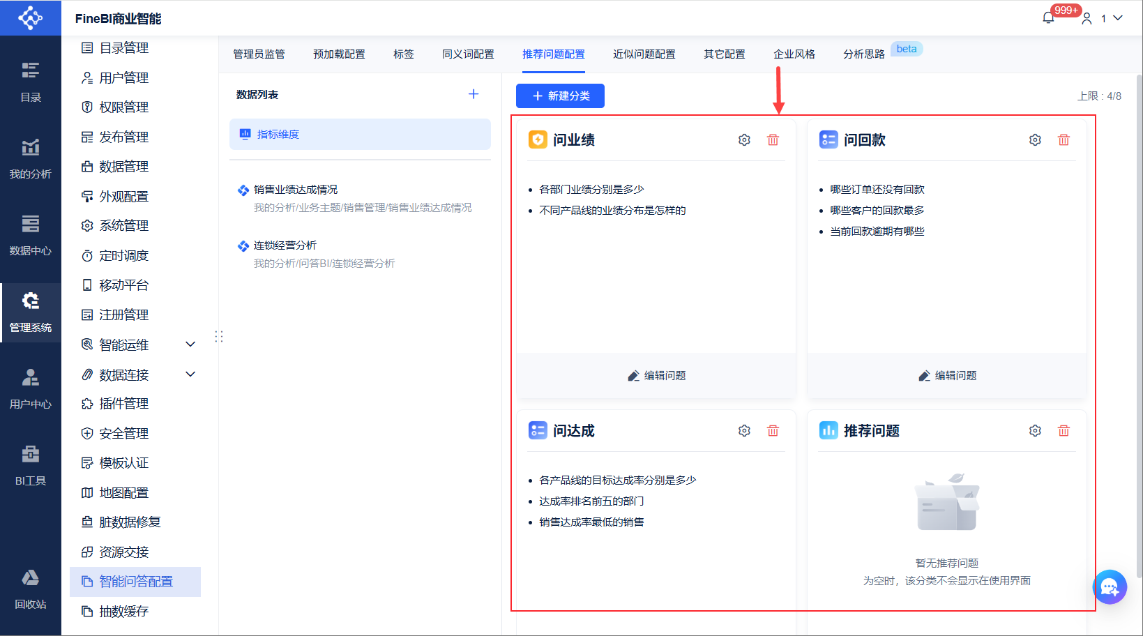 进入「智能问答配置>推荐问题配置」,点击「+」可以将分析主题添加到数据列表中,如下图所示: