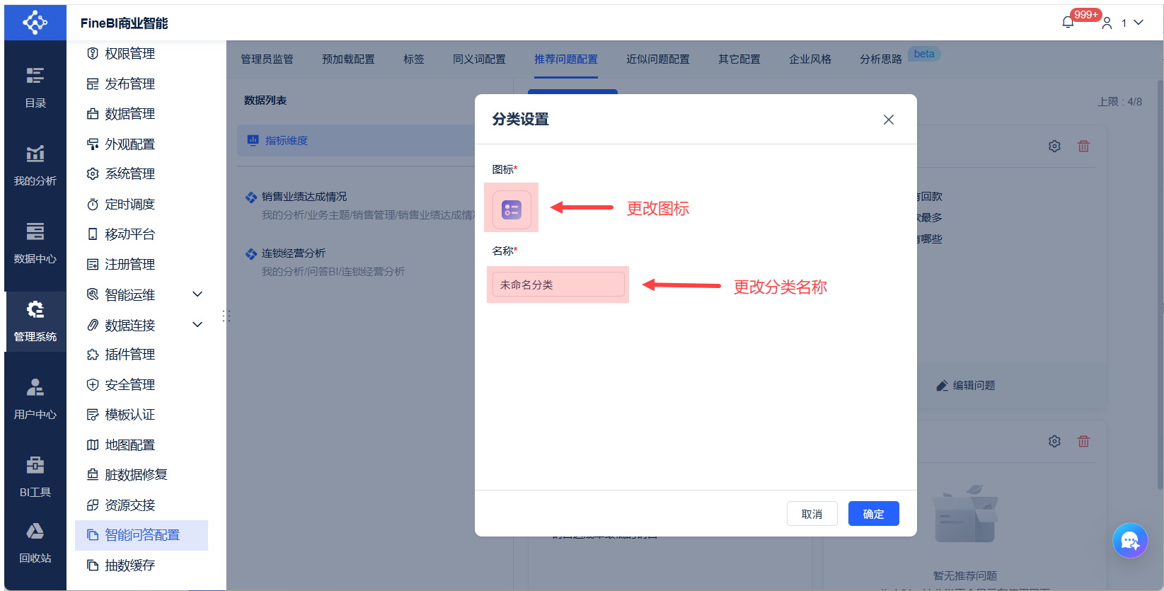 • 点击创建好的分析主题可对分析主题进行推荐问题配置。如下图所示: