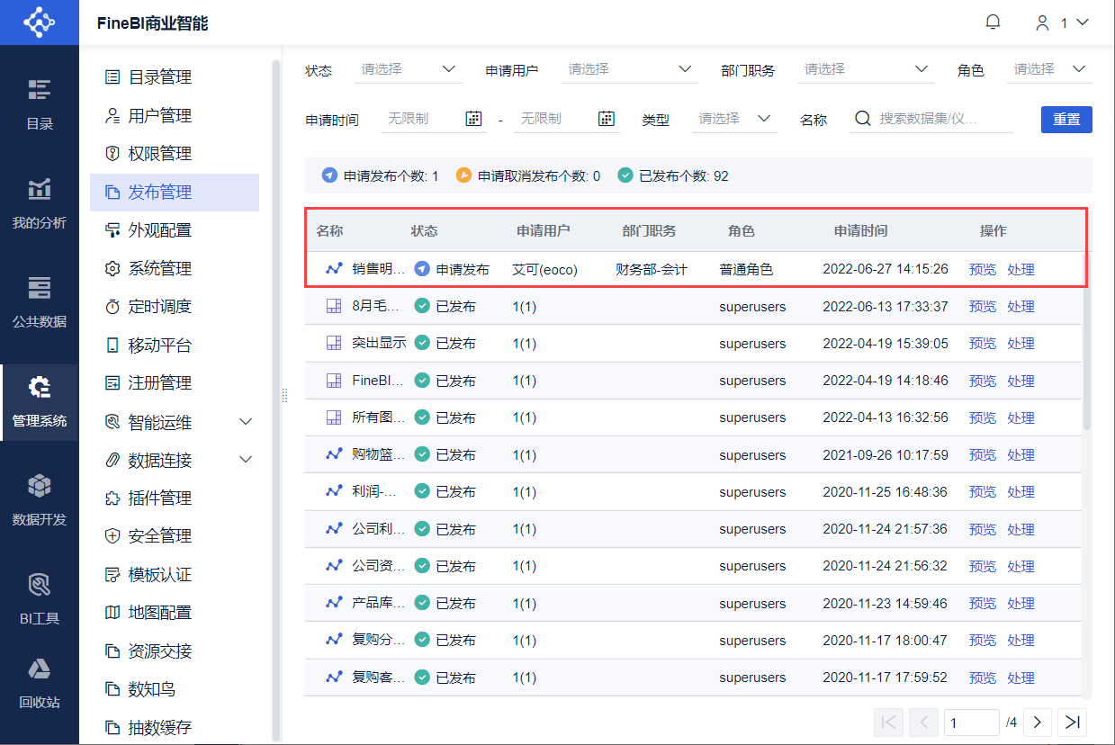 管理员登录FineBI系统,点击「管理系统>发布管理」,可根据部门、角色、用户、状态和申请时间等来搜索显示,方便快速找到。如下图所示: