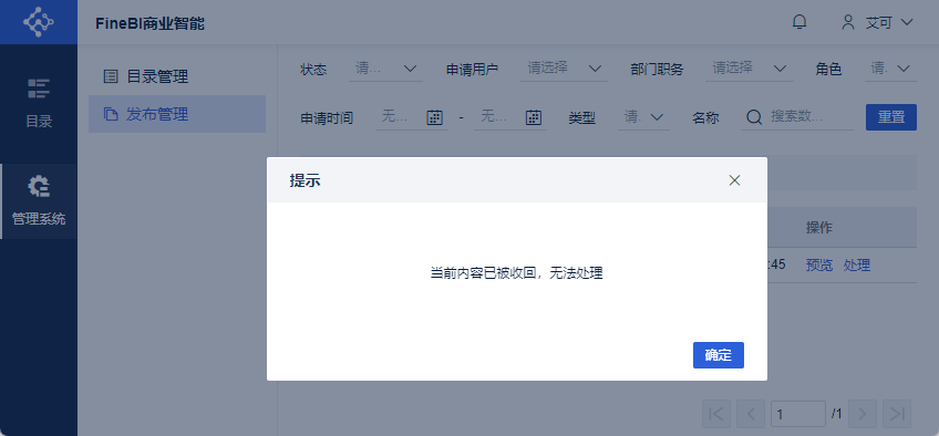 用户 申请取消发布 仪表板/数据集后,管理员登录FineBI系统,点击「管理系统>发布管理」,点击取消发布申请明细后的「处理」按钮,进入「取消发布」处理界面。