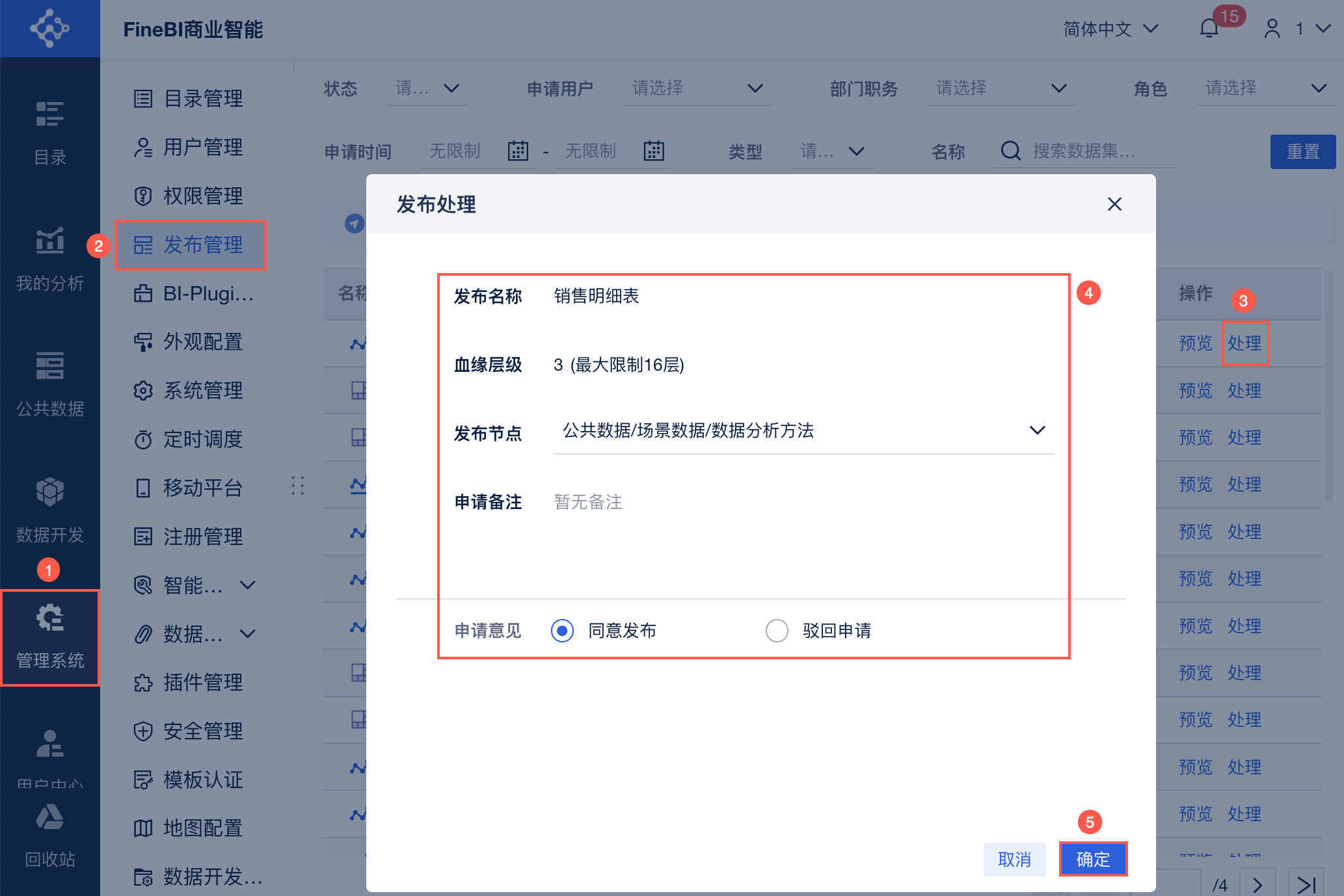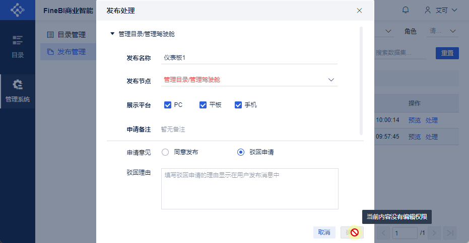 用户 申请发布 后,管理员登录FineBI系统,点击「管理系统>发布管理」,点击发布申请明细后的「处理」按钮,进入「发布处理」界面。