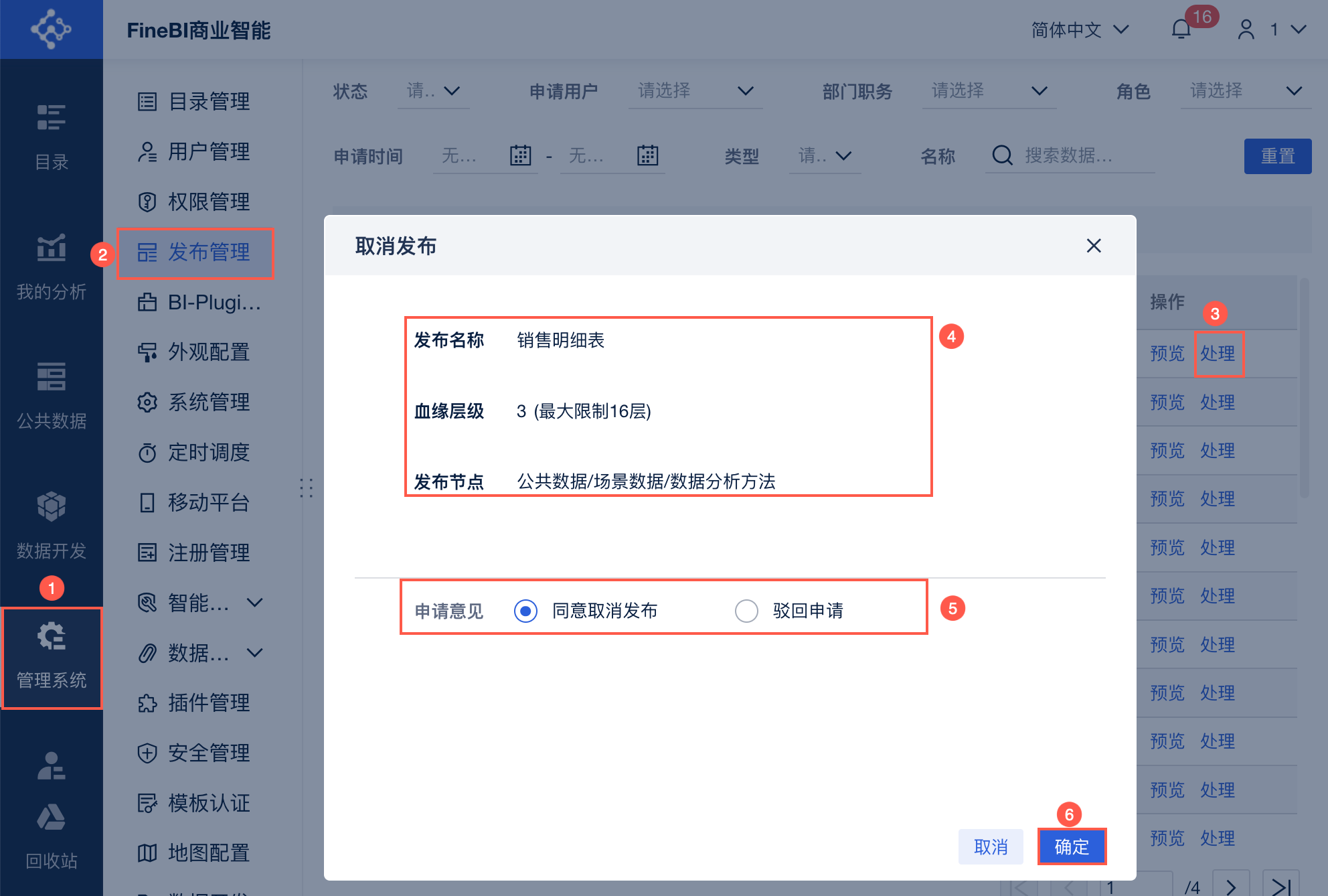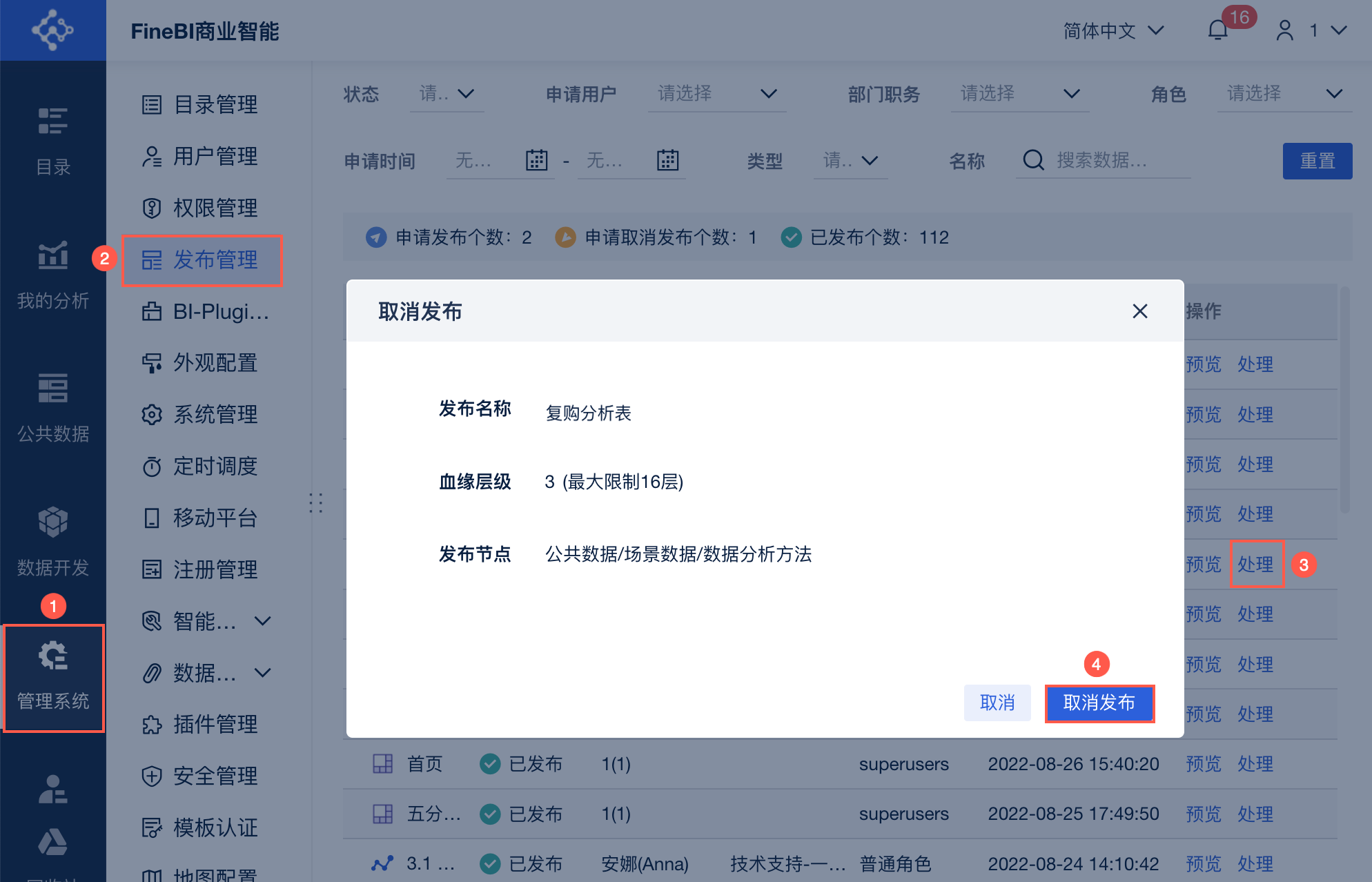 管理员登录FineBI系统,点击「管理系统>发布管理」,点击已发布明细后的「处理」按钮,进入「取消发布」处理界面,查看以下信息并判断是否可以取消发布。