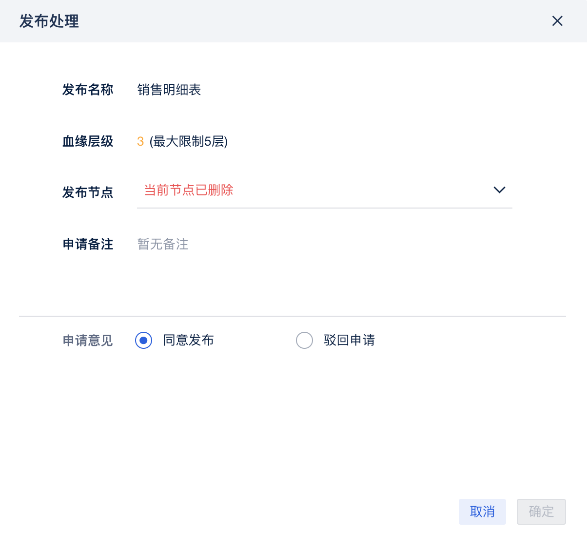 处理人对某项发布申请进行处理时,发布节点标红,提示「当前节点已删除」。「确定」按钮灰化,提示「当前内容没有编辑权限」。