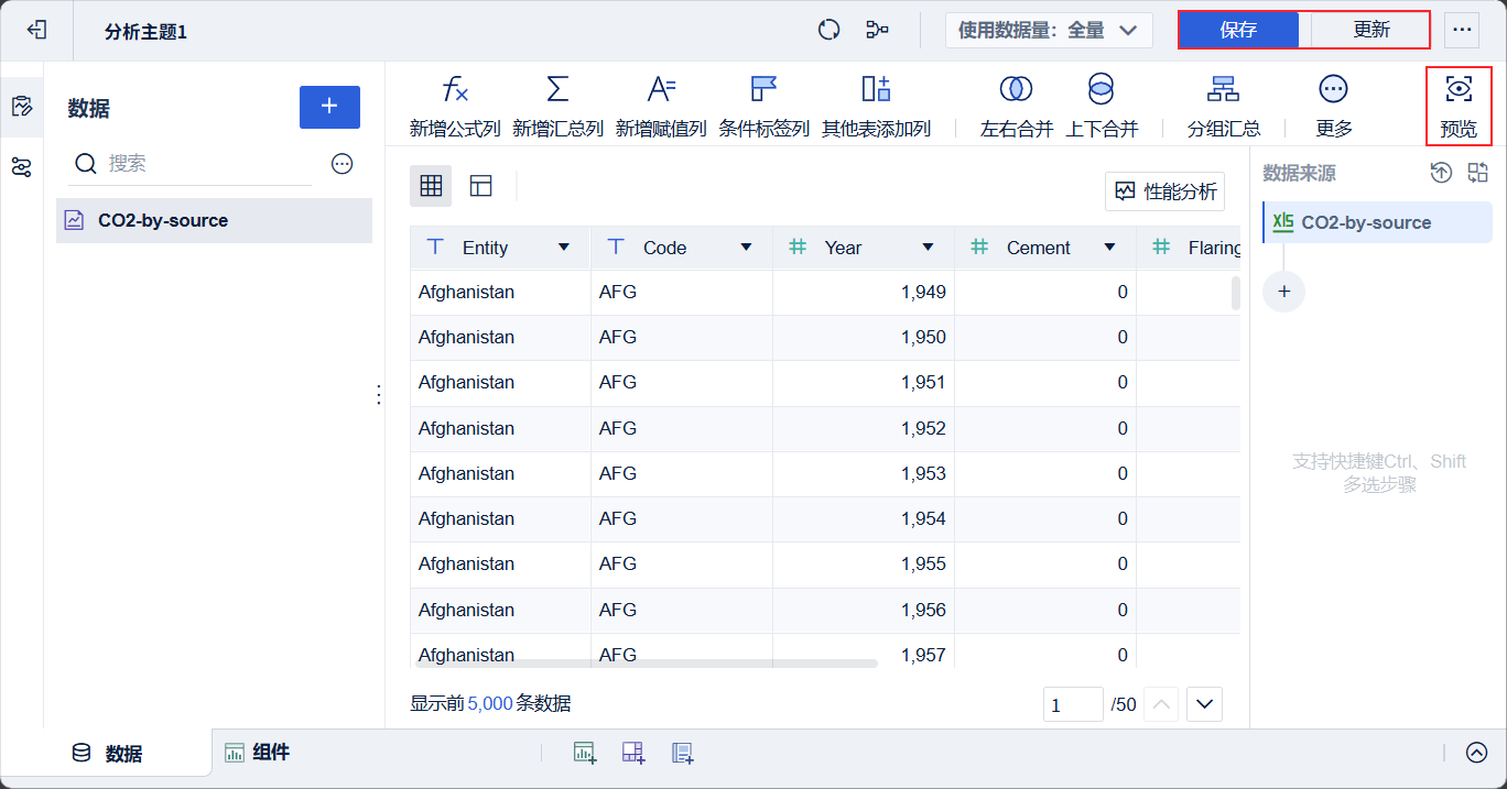 3)将左侧待分析区域的「Year」拖入分析区域的横轴,「Cement」、「Coal」、「Flaring」、「Gas」、「Oil」拖入纵轴,如下图所示: