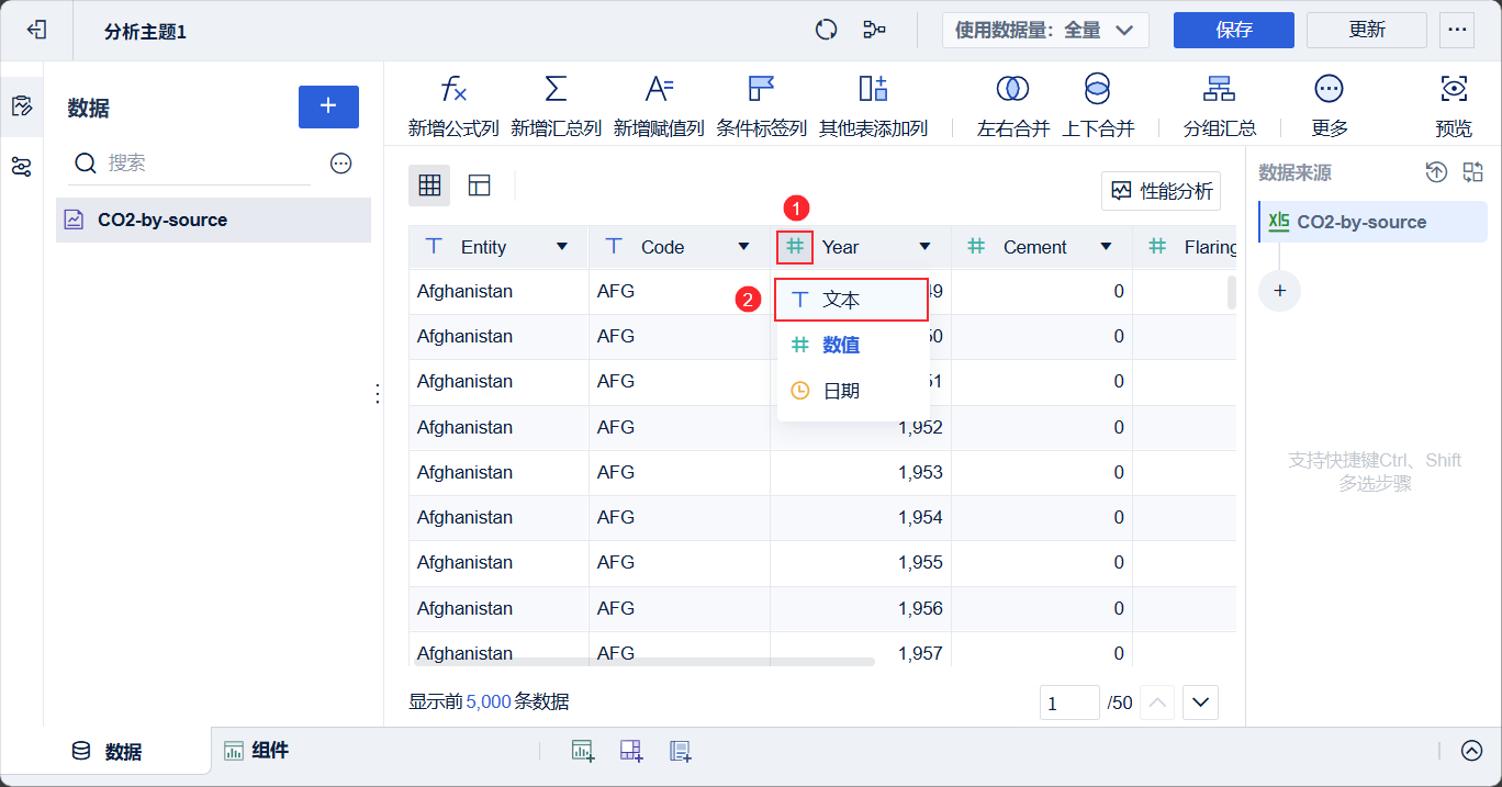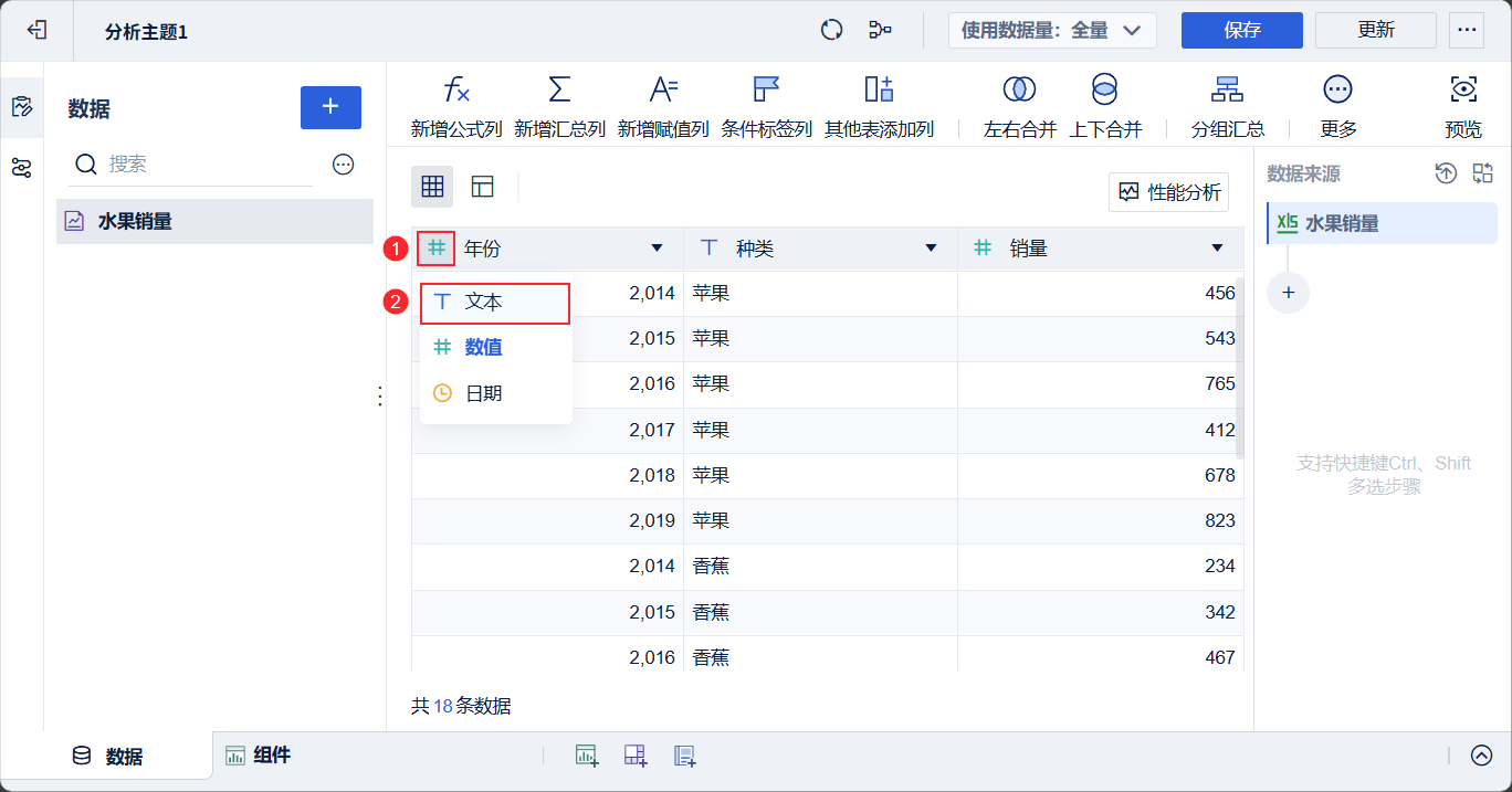 4)点击表头「年份」字段前的「#」按钮,选择「T 文本」,设置其为文本格式,如下图所示: