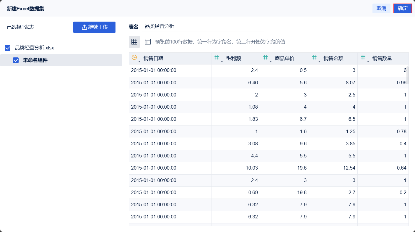 2)点击「本地Excel文件>上传数据」,上传表数据。如下图所示: