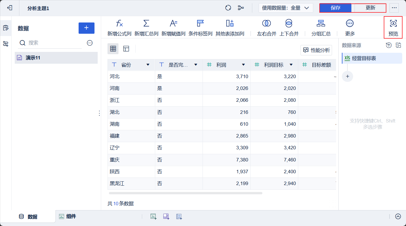 例如,进行利润分析时,为尽可能全面地呈现信息,用「柱形图」展示各个省份的利润情况,用「点图」来展现利润目标是否达成的情况,以及用「面积图」展现利润达成之间的差额,同时再使用「折线图」展示各省份的销售额和销售额目标,方便进行对比查看,如下图所示: