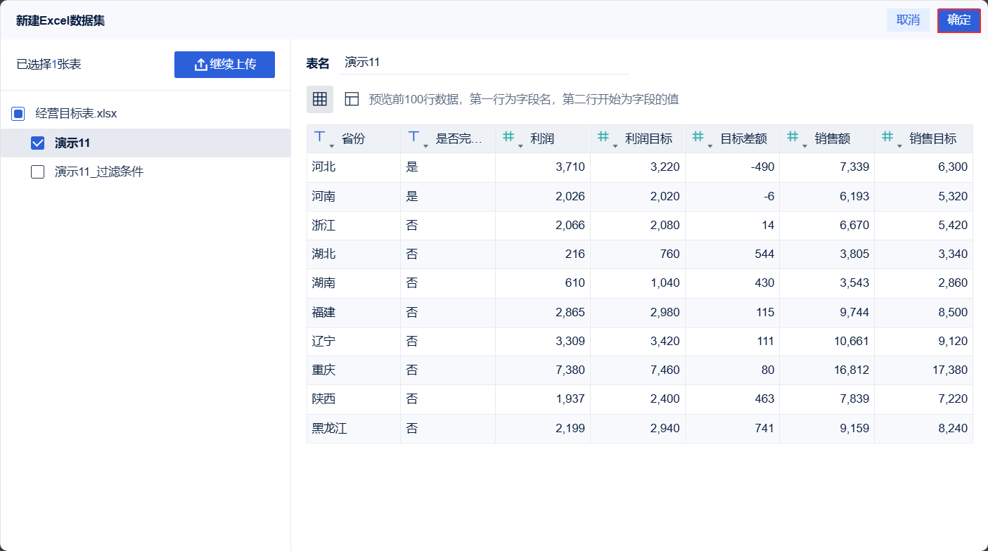 2)点击「本地Excel文件>上传数据」,上传表数据。如下图所示: