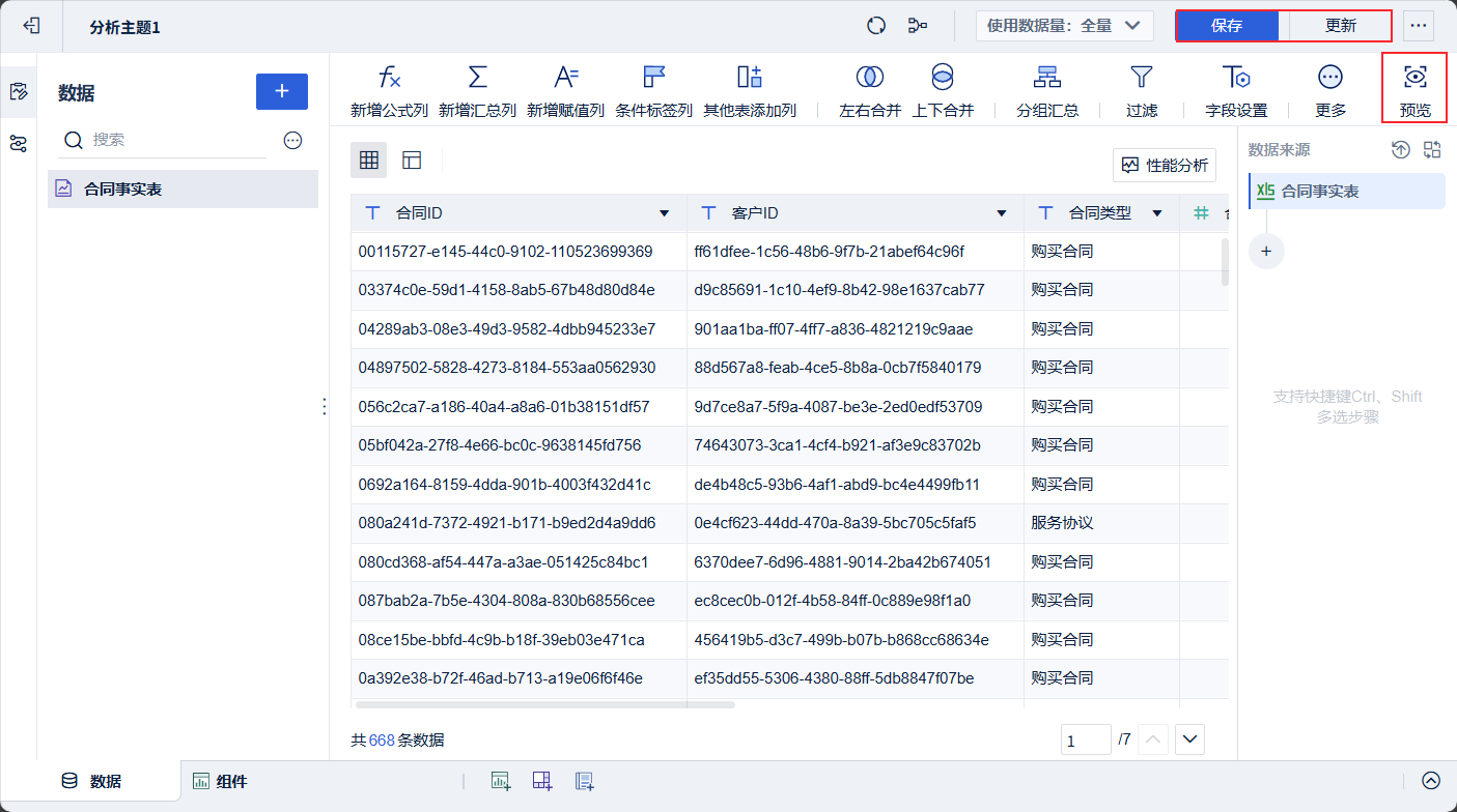 横纵轴支持拖入多个字段多维度多指标展示。例如,将左侧待分析区域的「合同付款类型」字段也拖入分析区域的横纵轴。
