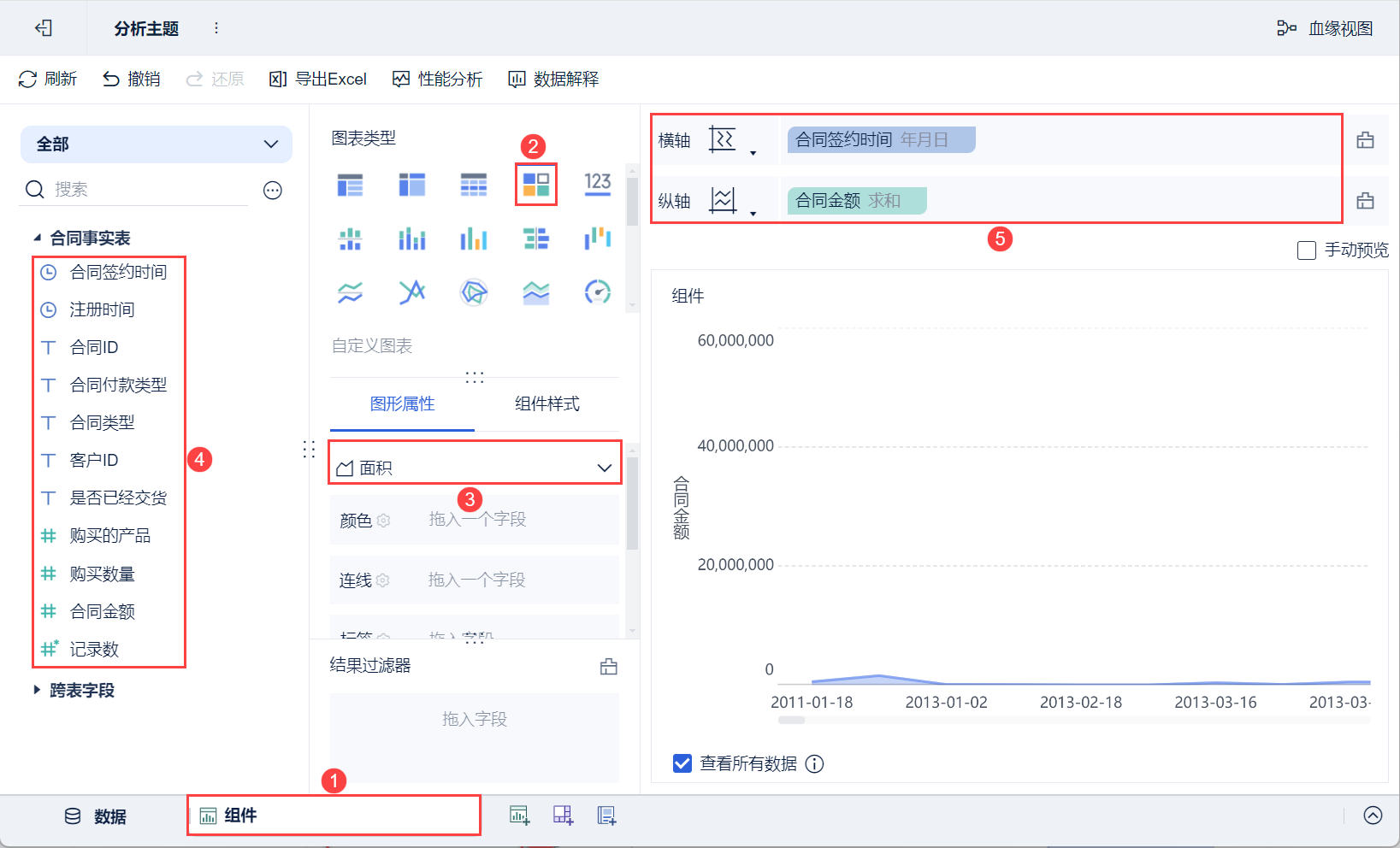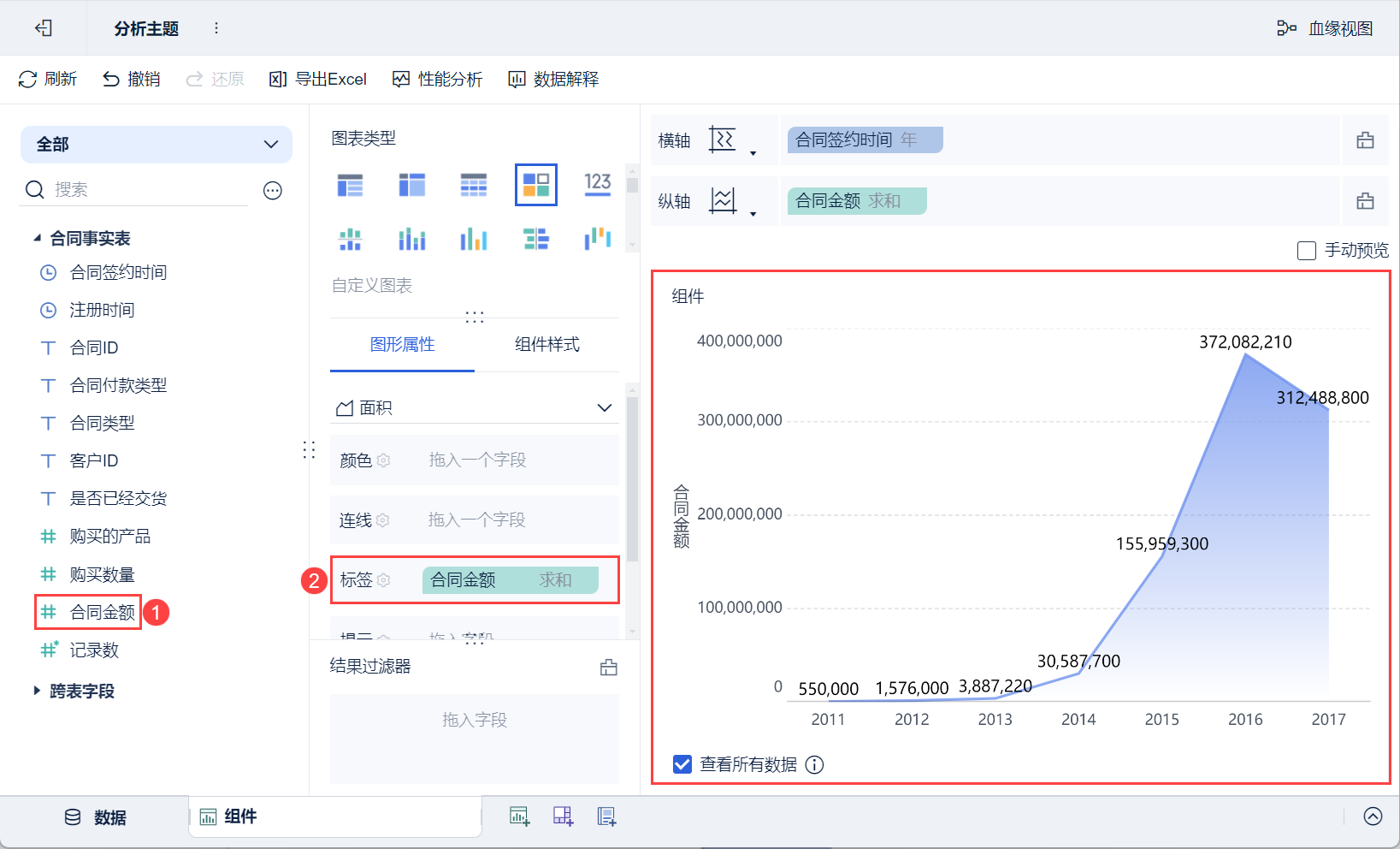 3)将左侧待分析区域的「合同签约时间」拖入分析区域的横轴,「合同金额」拖入纵轴,如下图所示: