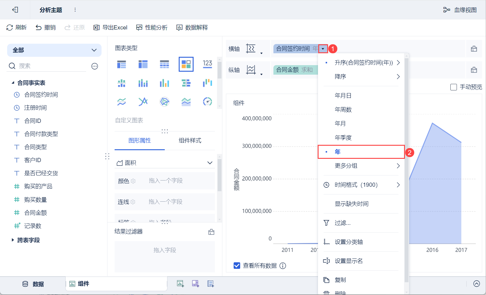 4)点击分析区域横轴「合同签约时间」的下拉按钮,选择「年」分组,如下图所示: