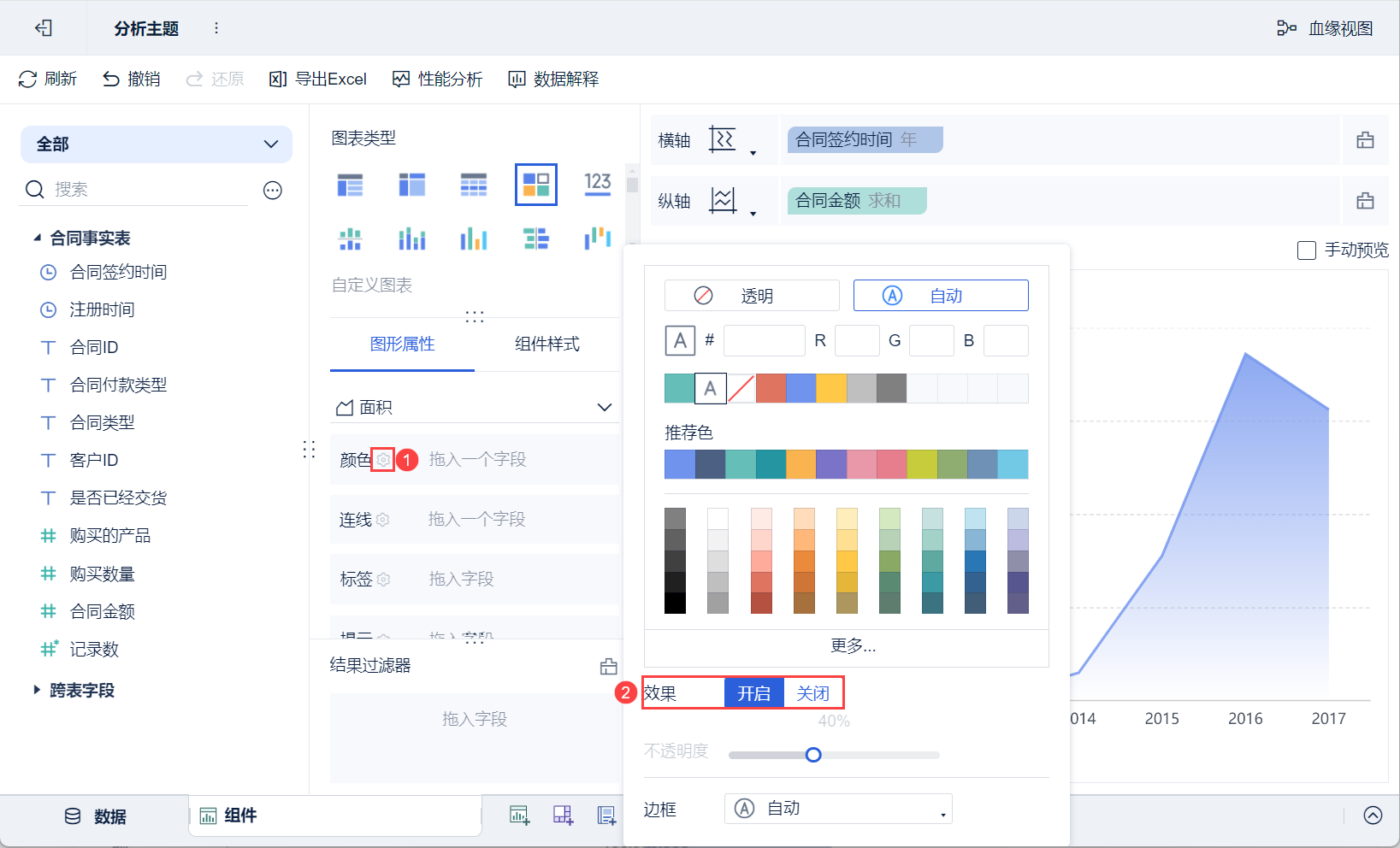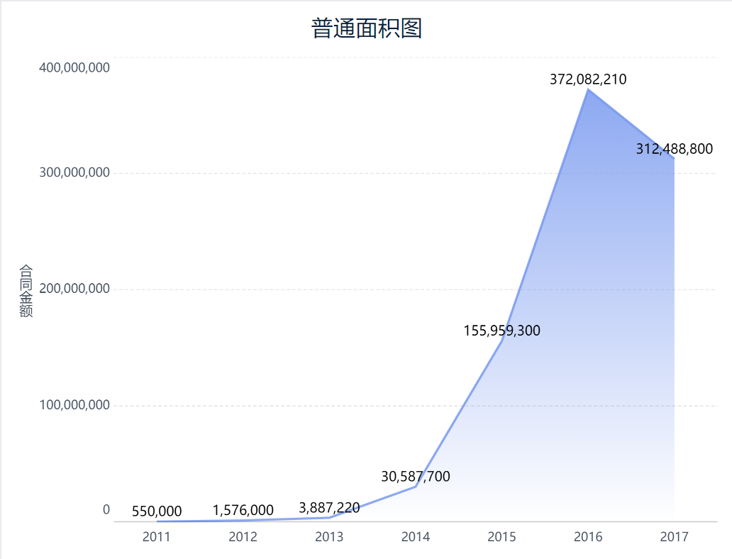 例如,用面积图展示不同年份合同金额的变化情况,如下图所示: