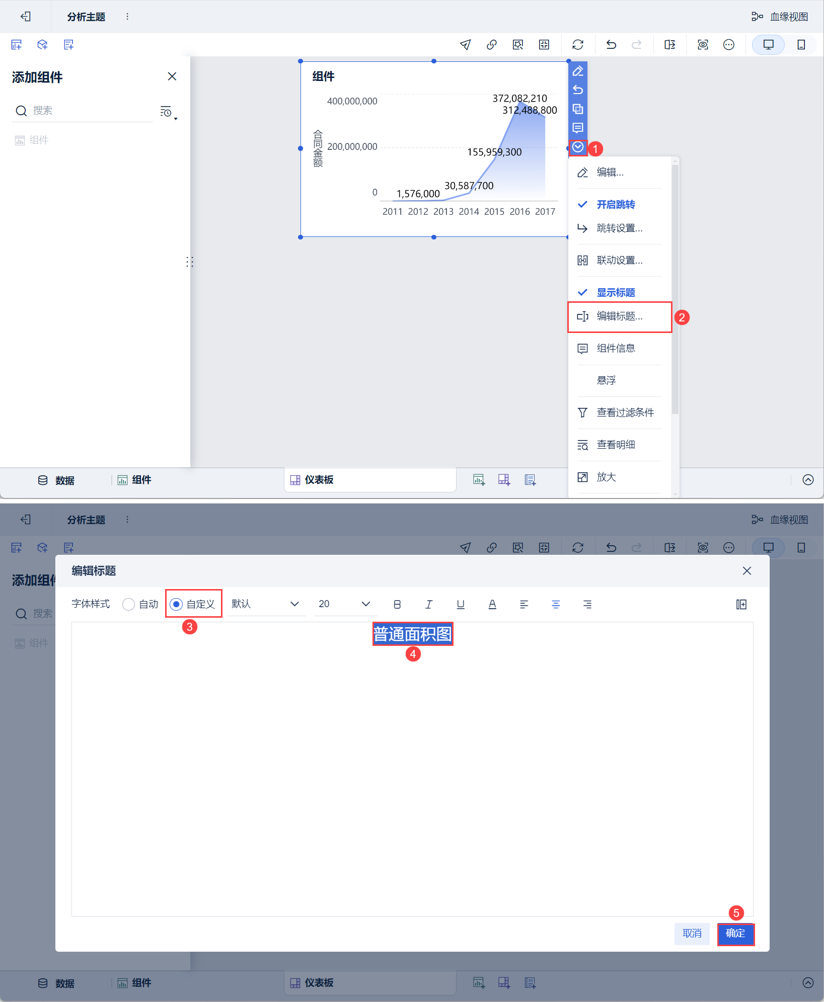 3)下拉选择「编辑标题」,样式选择「自定义」,设置标题为「普通面积图」,点击「确定」。如下图所示: