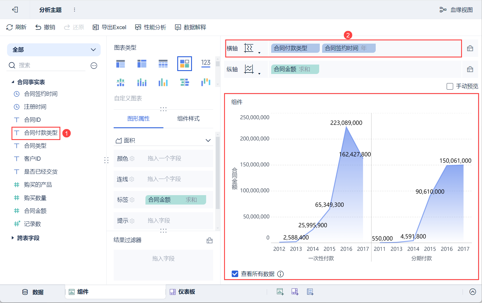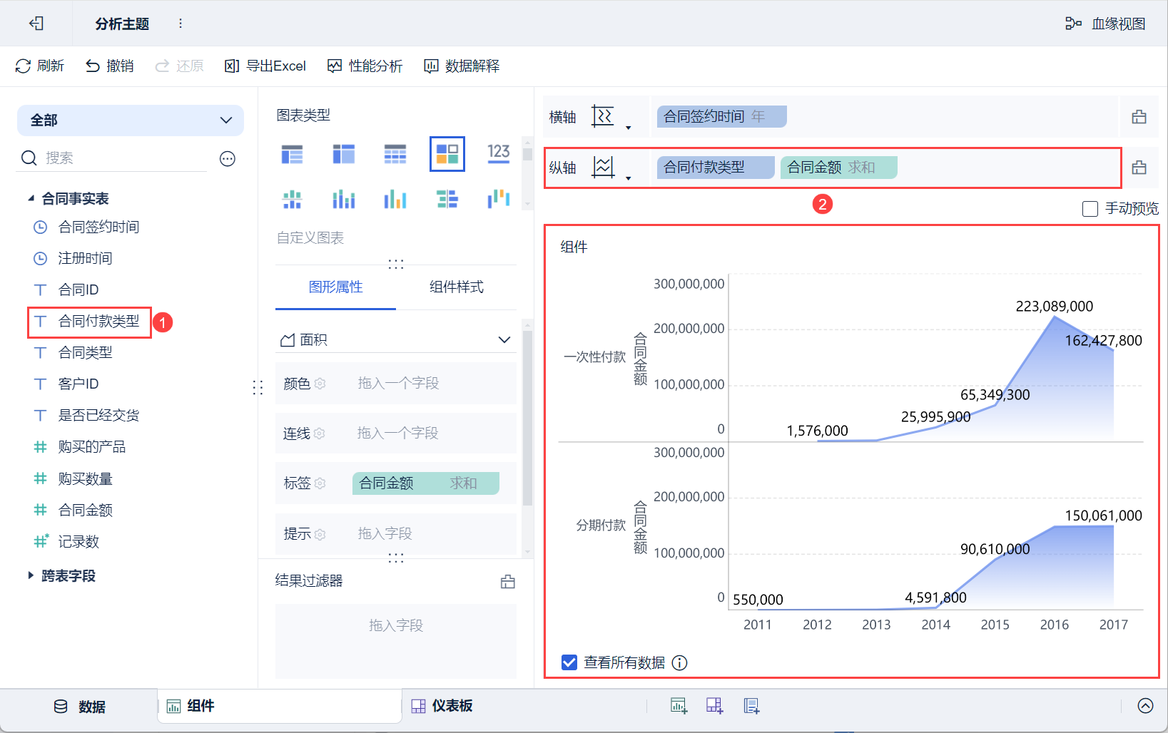 横纵轴支持拖入多个字段多维度多指标展示。例如,将左侧待分析区域的「合同付款类型」字段也拖入分析区域的横纵轴。