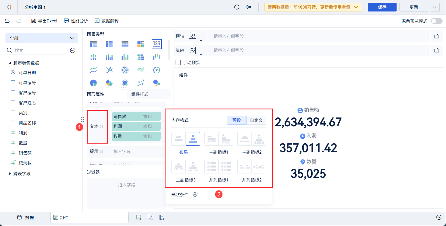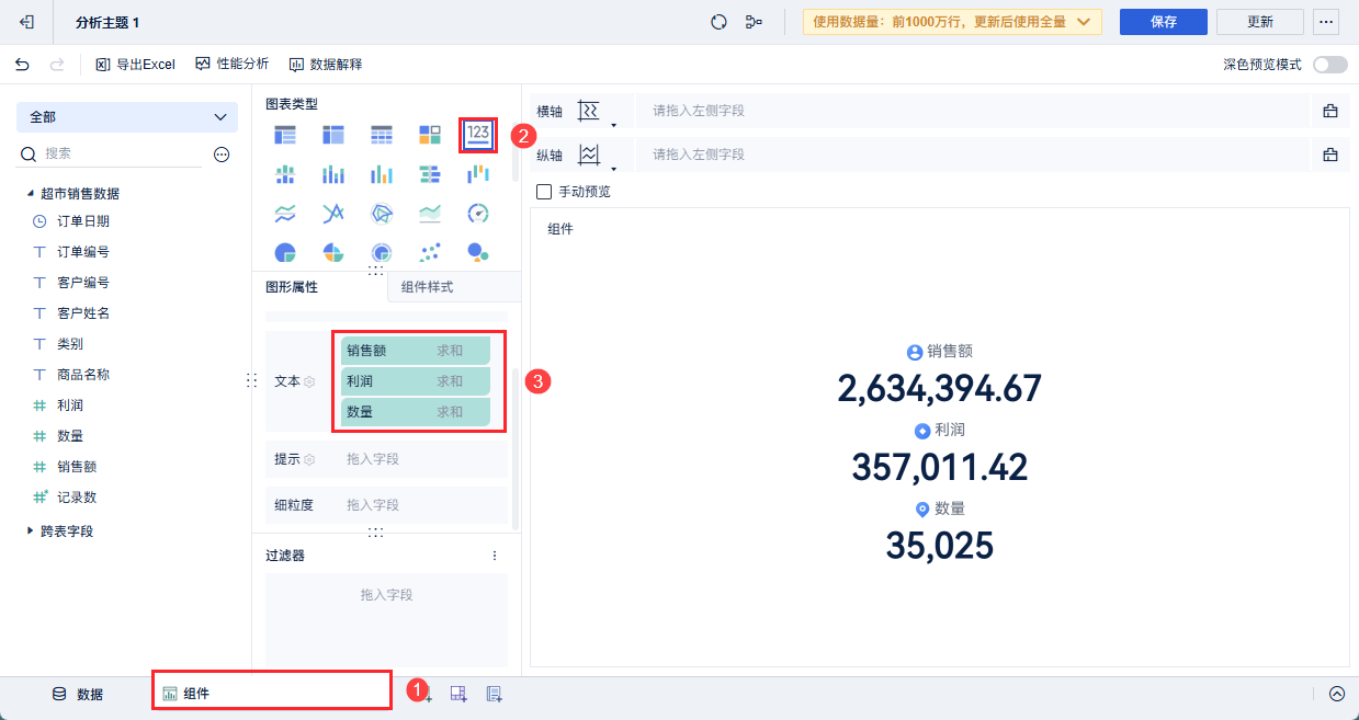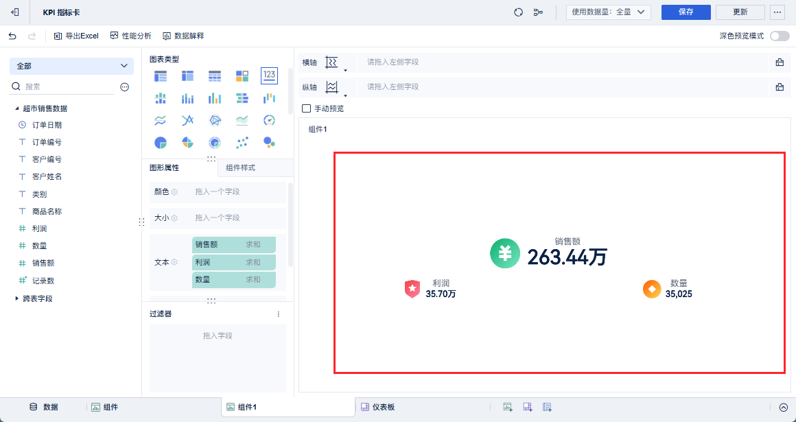 注:拖入的指标字段,指标值不能为空,否则KPI指标卡不生效。