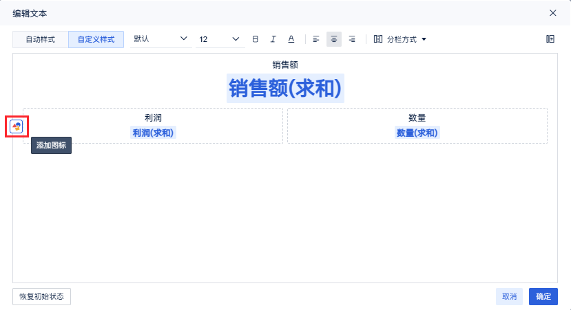 图标只能添加到分栏中。「销售额」所在行没有分栏,所以需要先添加分栏再添加图形。如下图所示: