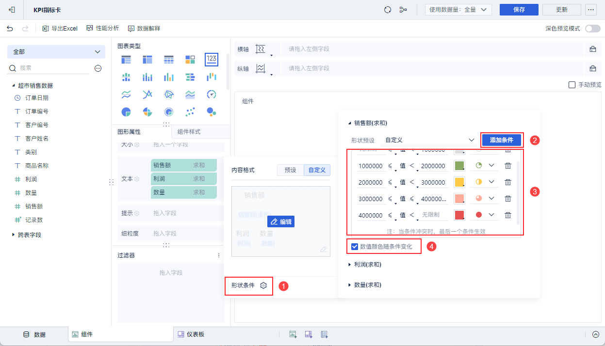 3)勾选「数值颜色随条件变化」,可以确保数值显示的颜色与条件设置的颜色保持一致。