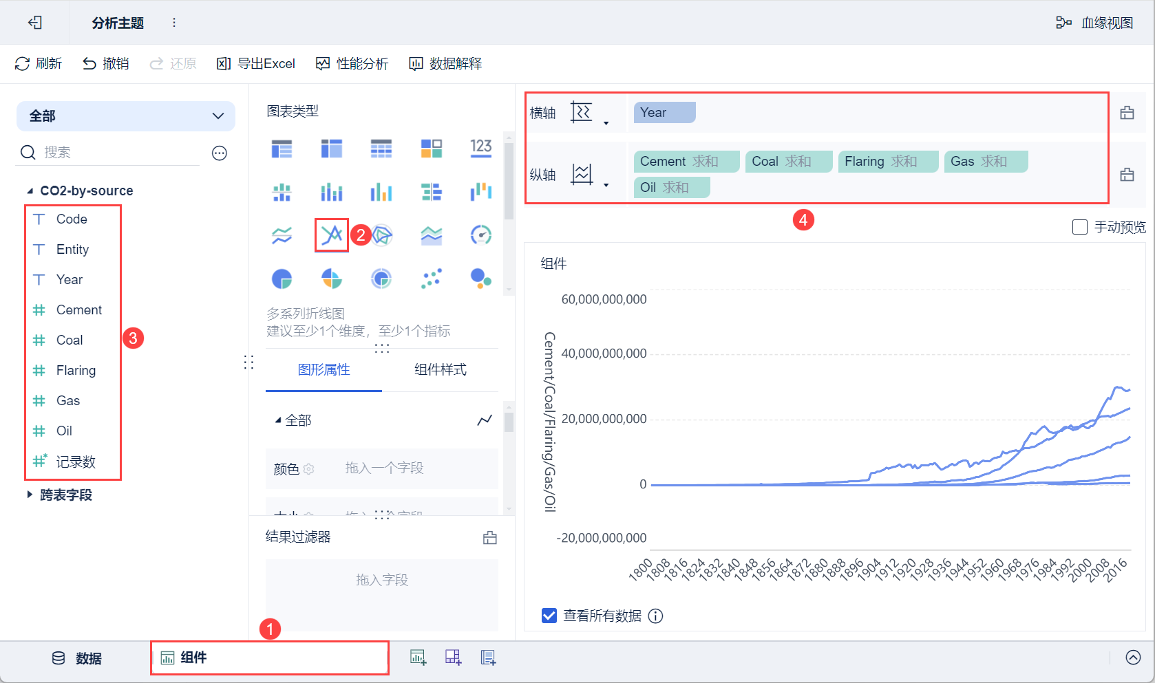 3)将左侧待分析区域的「Year」拖入分析区域的横轴,「Cement」、「Coal」、「Flaring」、「Gas」、「Oil」拖入纵轴,如下图所示: