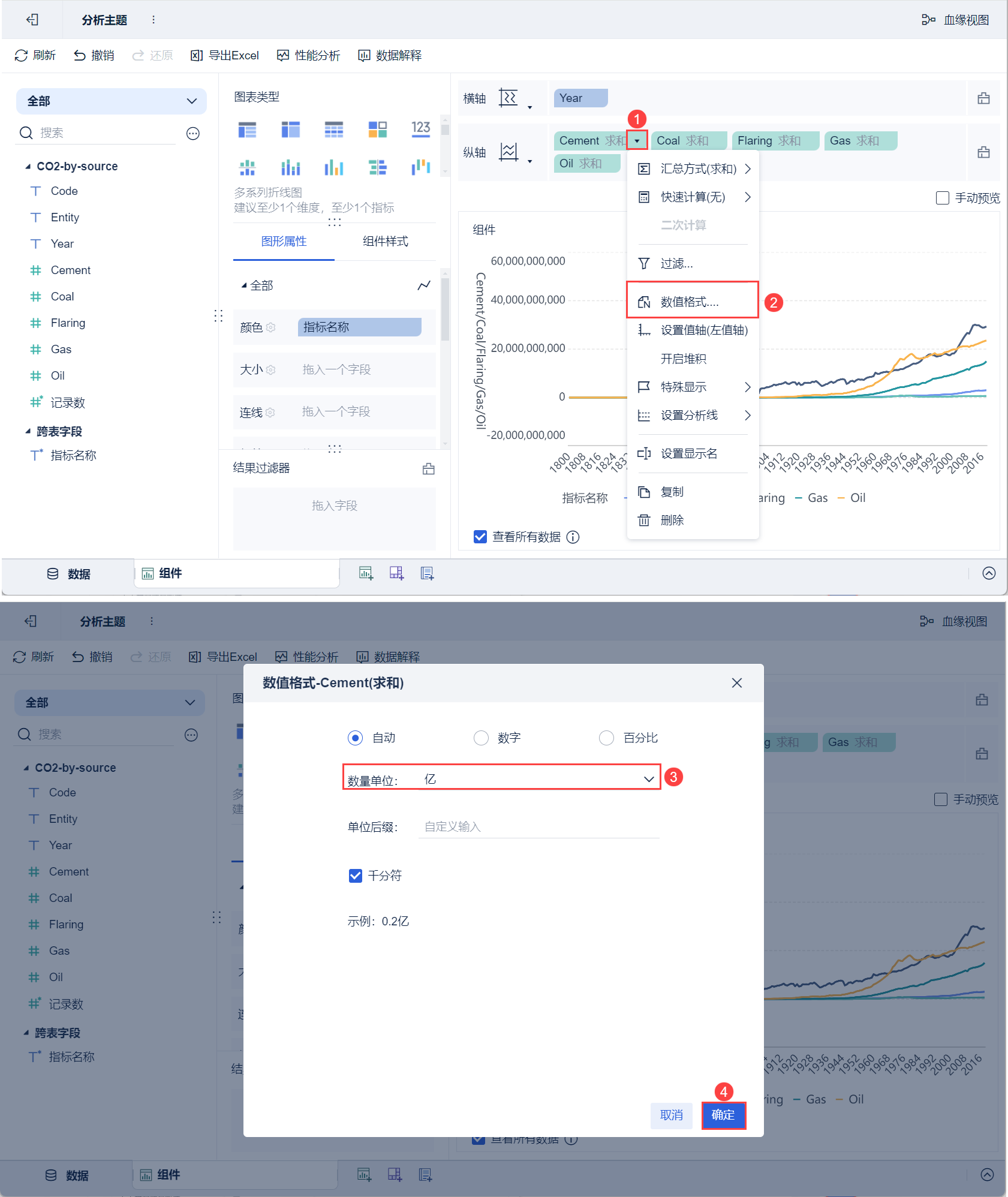 点击纵轴「 Cement 」字段的下拉按钮,选择「数值格式」,在弹出的设置框中数量单位选择「亿」,点击「确定」,如下图所示: