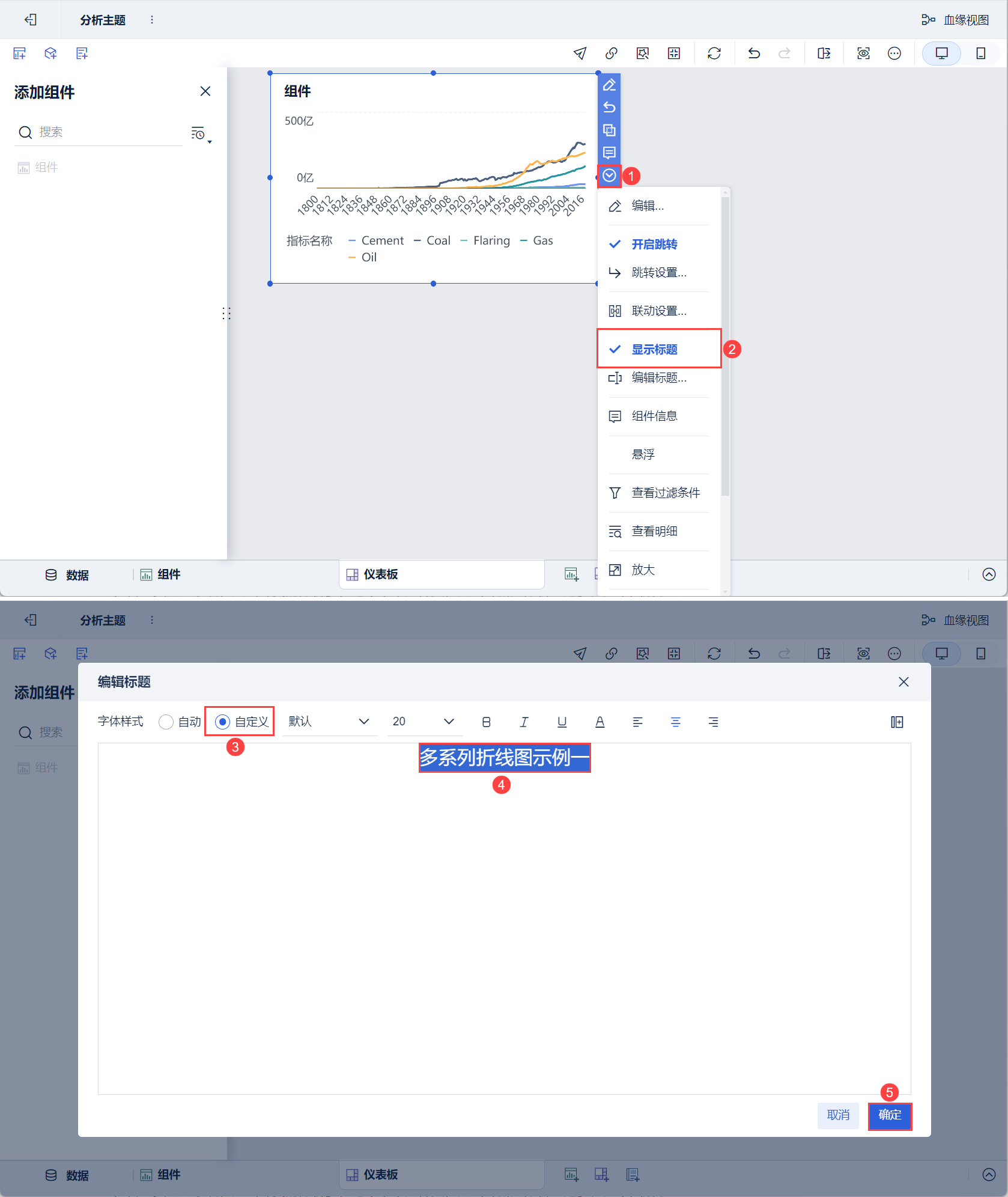 3)下拉选择「编辑标题」,样式选择「自定义」,设置标题为「多系列折线图示例一」,点击「确定」。如下图所示: