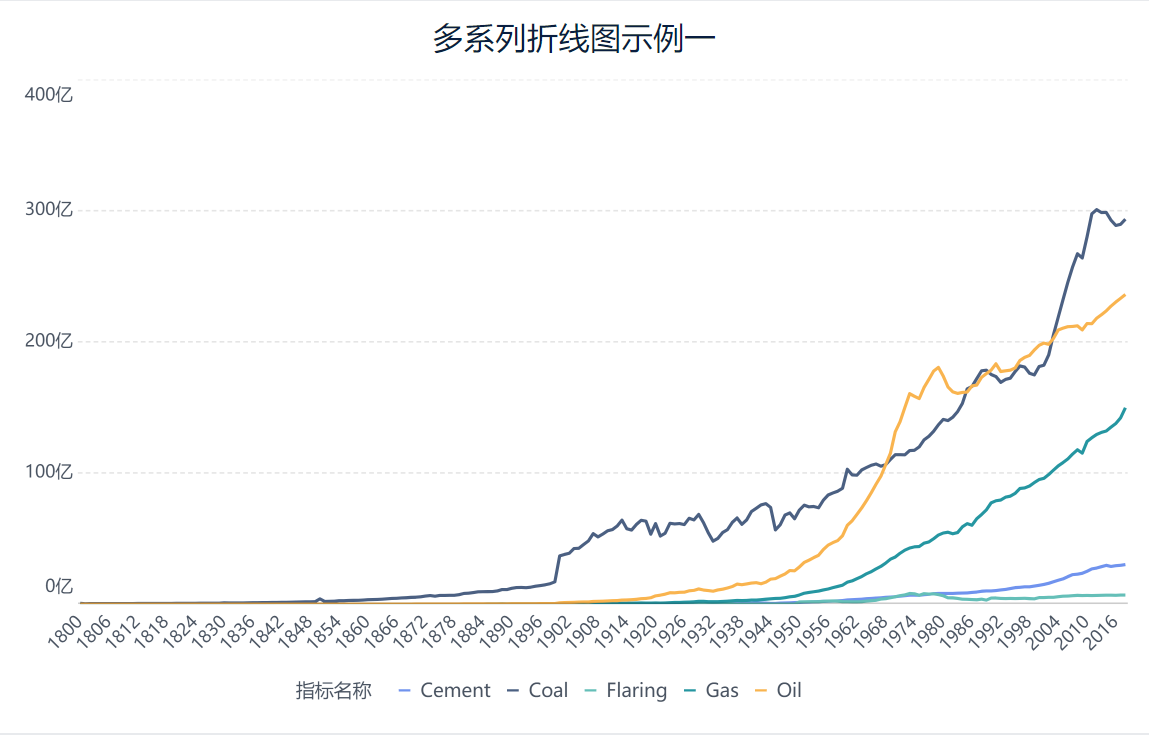 例如,用多系列折线图展示自 1800 年至 2017 年全世界能源消耗情况,图中不同颜色的折线代表不同的能源类型(水泥、煤炭、燃气、天然气、石油),如下图所示: