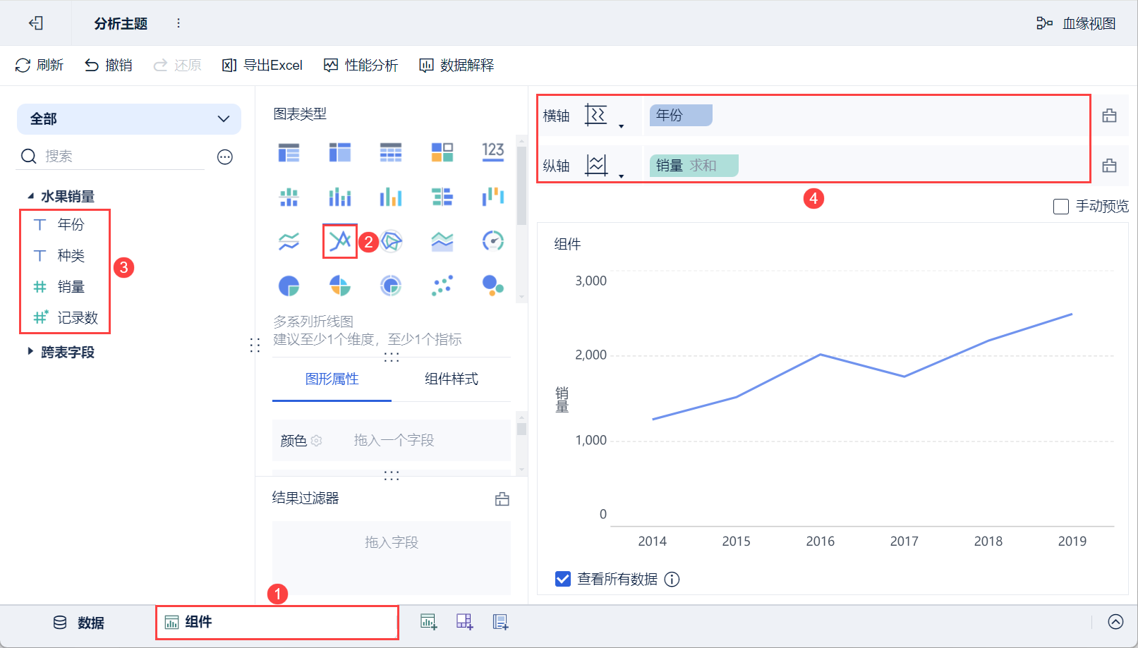 3)将左侧待分析区域的「年份」拖入分析区域的横轴,「销量」拖入纵轴,如下图所示: