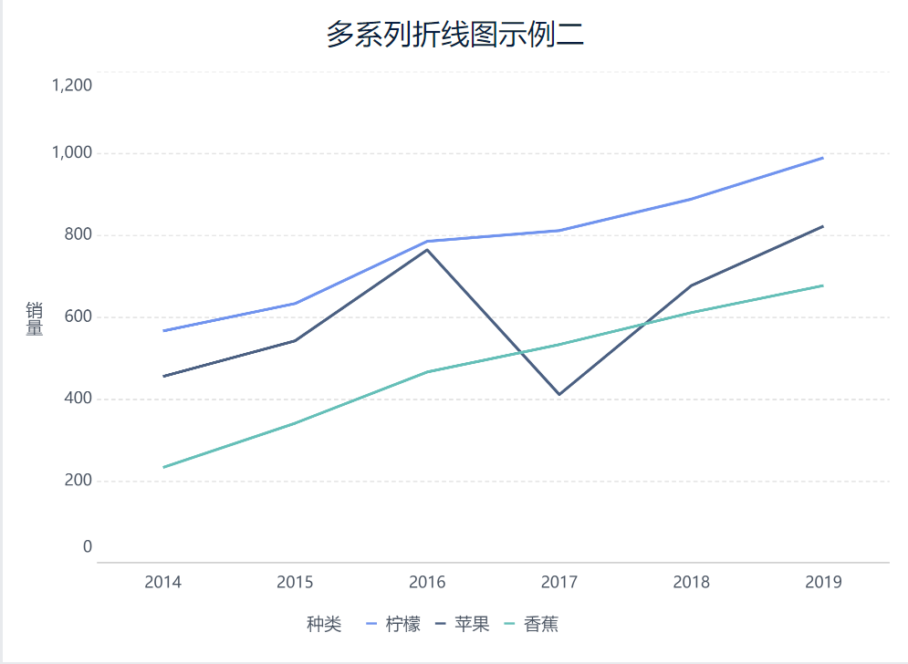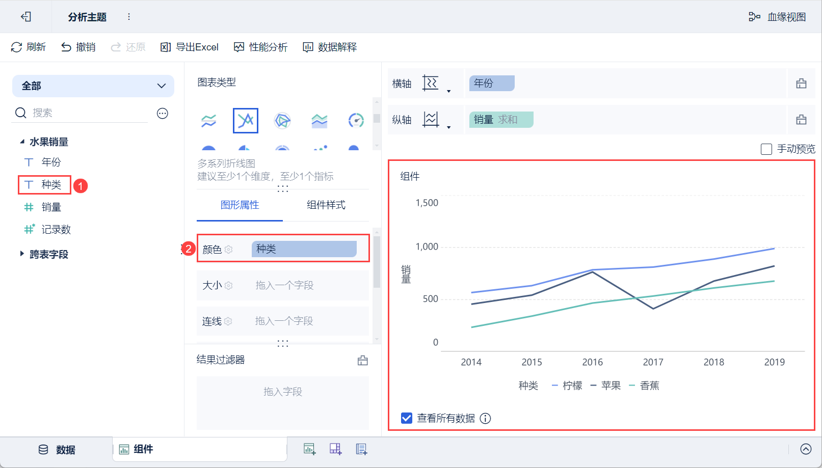 4)将左侧待分析区域「种类」字段拖入到「图形属性」下的颜色栏,生成一个多系列折线图,不同颜色的线代表不同种类水果的销量,如下图所示:
