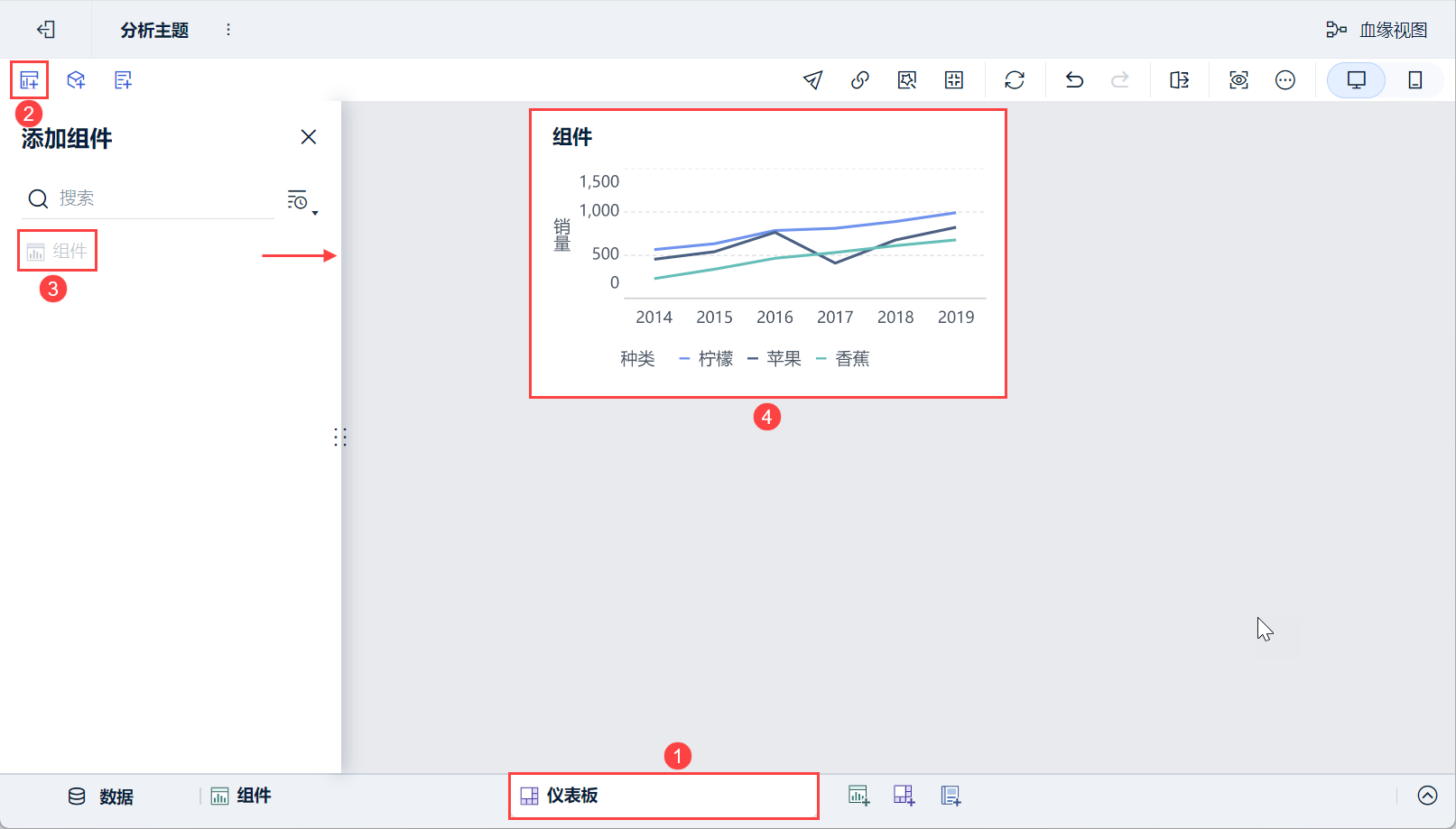 2)进入仪表板编辑界面,将组件拖入至仪表板中,如下图所示: