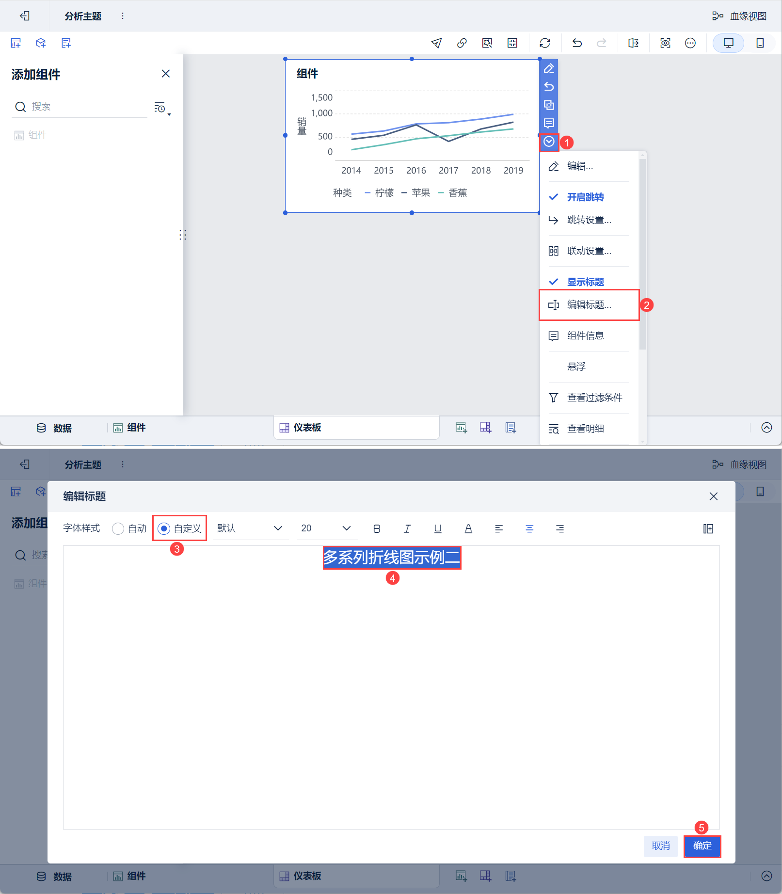 3)下拉选择「编辑标题」,样式选择「自定义」,设置标题为「多系列折线图示例二」,点击「确定」。如下图所示: