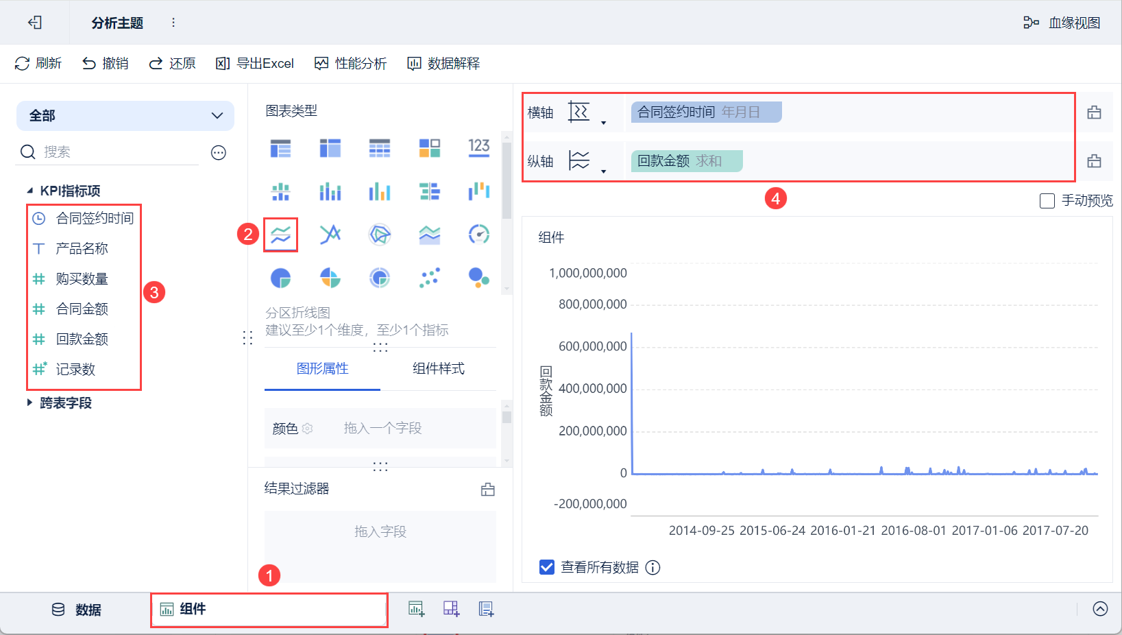 3)将左侧待分析区域的「合同签约时间」拖入分析区域的横轴,「回款金额」拖入纵轴,如下图所示: