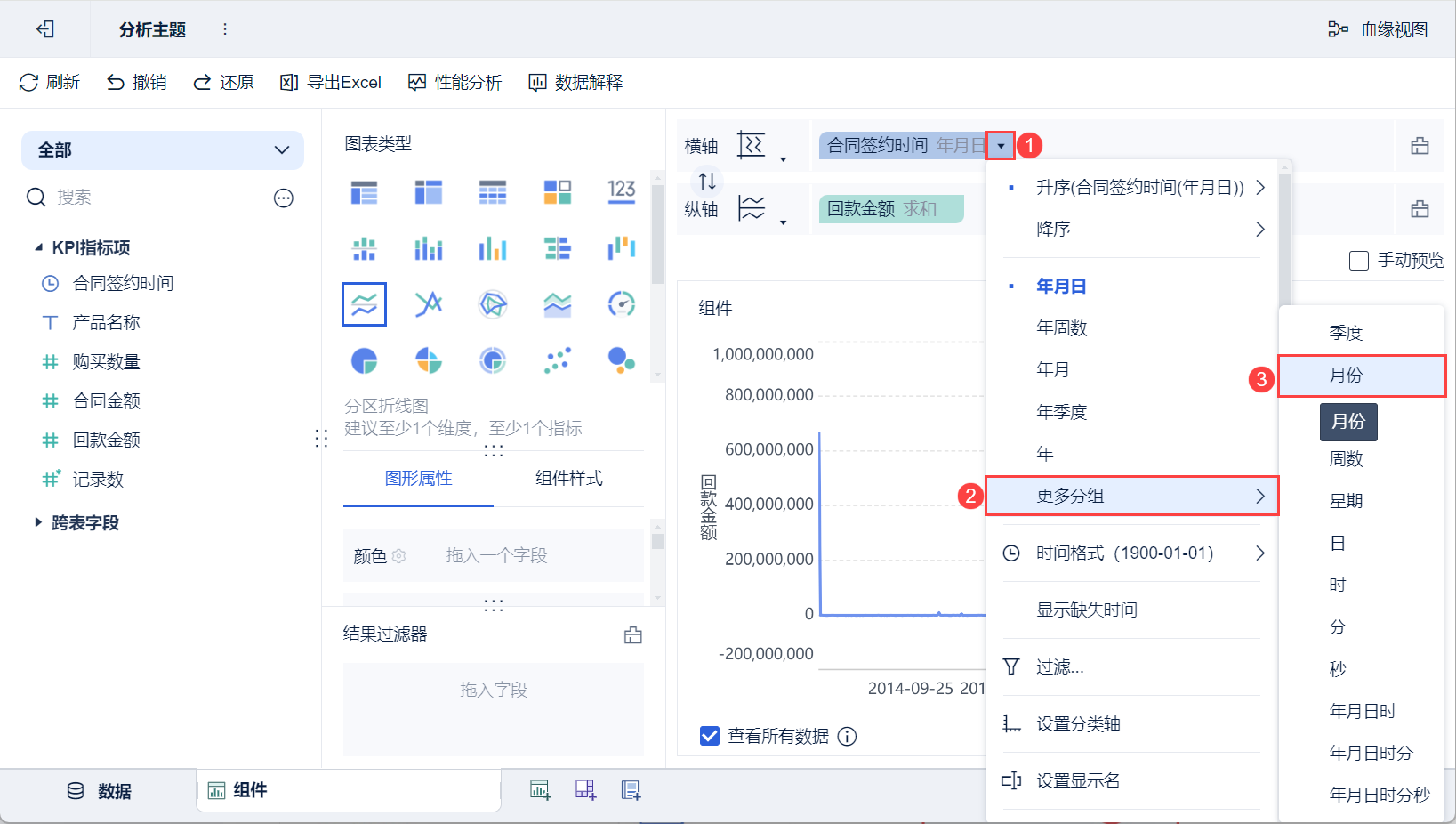 4)点击横轴「合同签约时间」的下拉按钮,选择「更多分组>月份」,如下图所示: