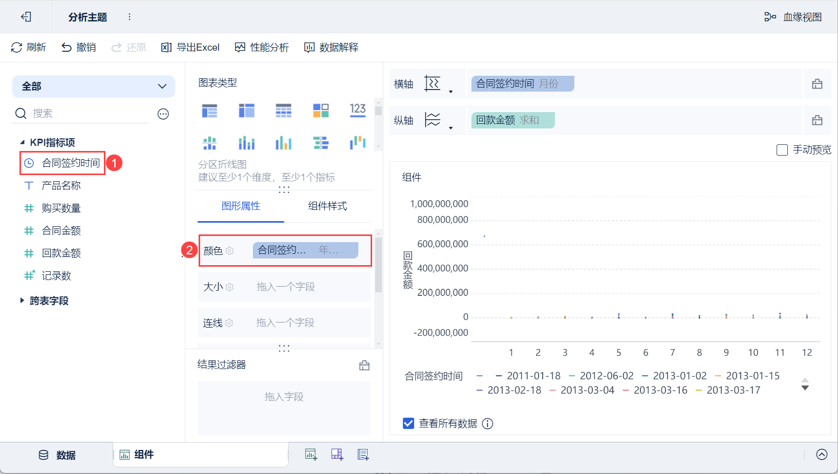 1)将左侧待分析区域的「合同签约时间」拖入「图形属性」下的颜色栏,如下图所示: