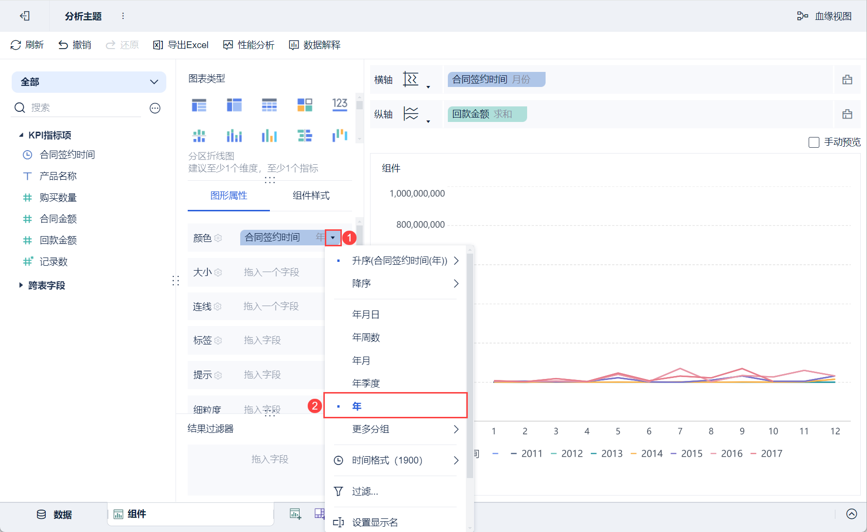 2)点击颜色栏「合同签约时间」的下拉按钮,选择「年」分组,如下图所示: