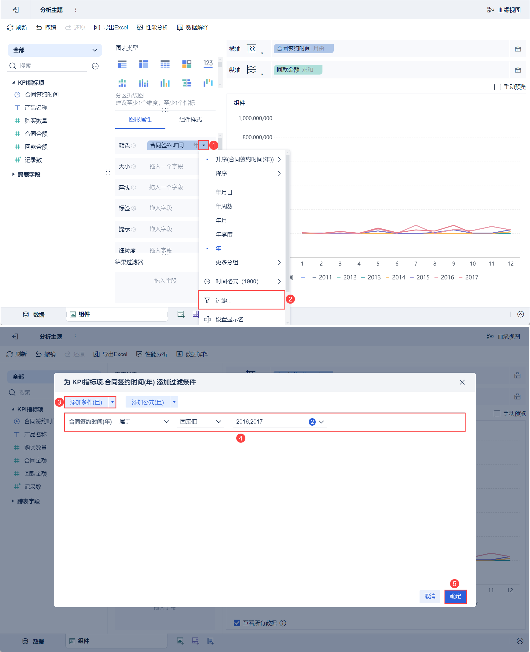 3)继续点击颜色栏「合同签约时间」的下拉按钮,选择「过滤」,在弹出的设置框中添加过滤条件,筛选出2016年和2017年的数据,点击「确定」,如下图所示: