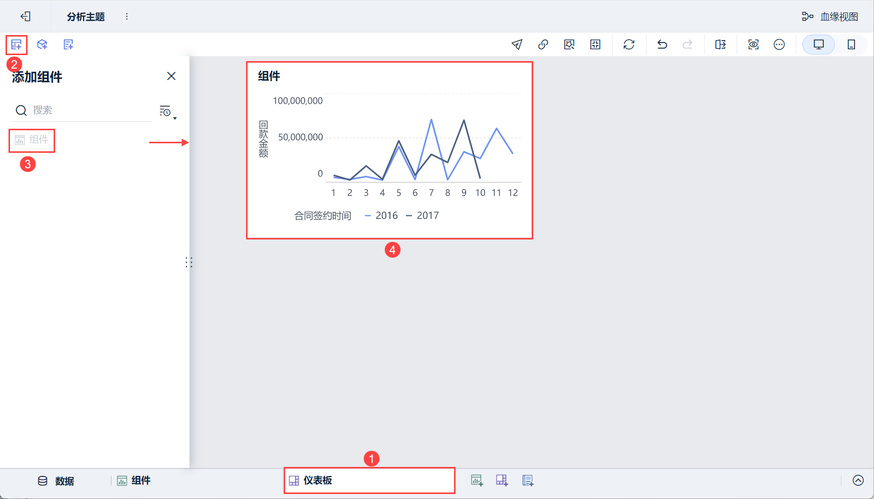 1)点击分析主题编辑界面下方添加仪表板。