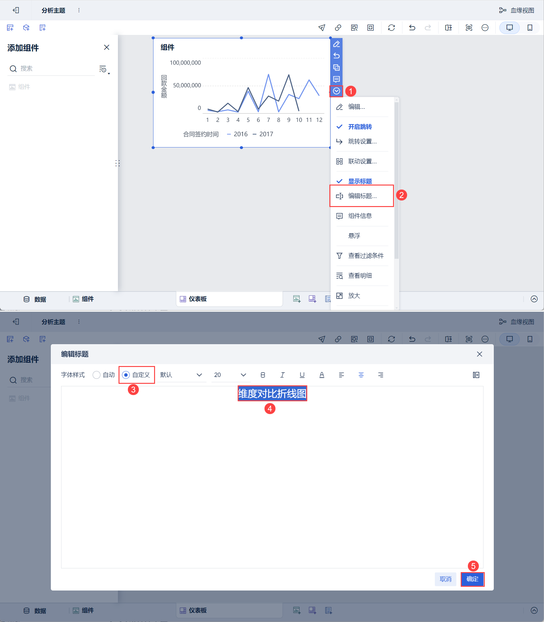 3)下拉选择「编辑标题」,样式选择「自定义」,设置标题为「维度对比折线图」,点击「确定」。如下图所示: