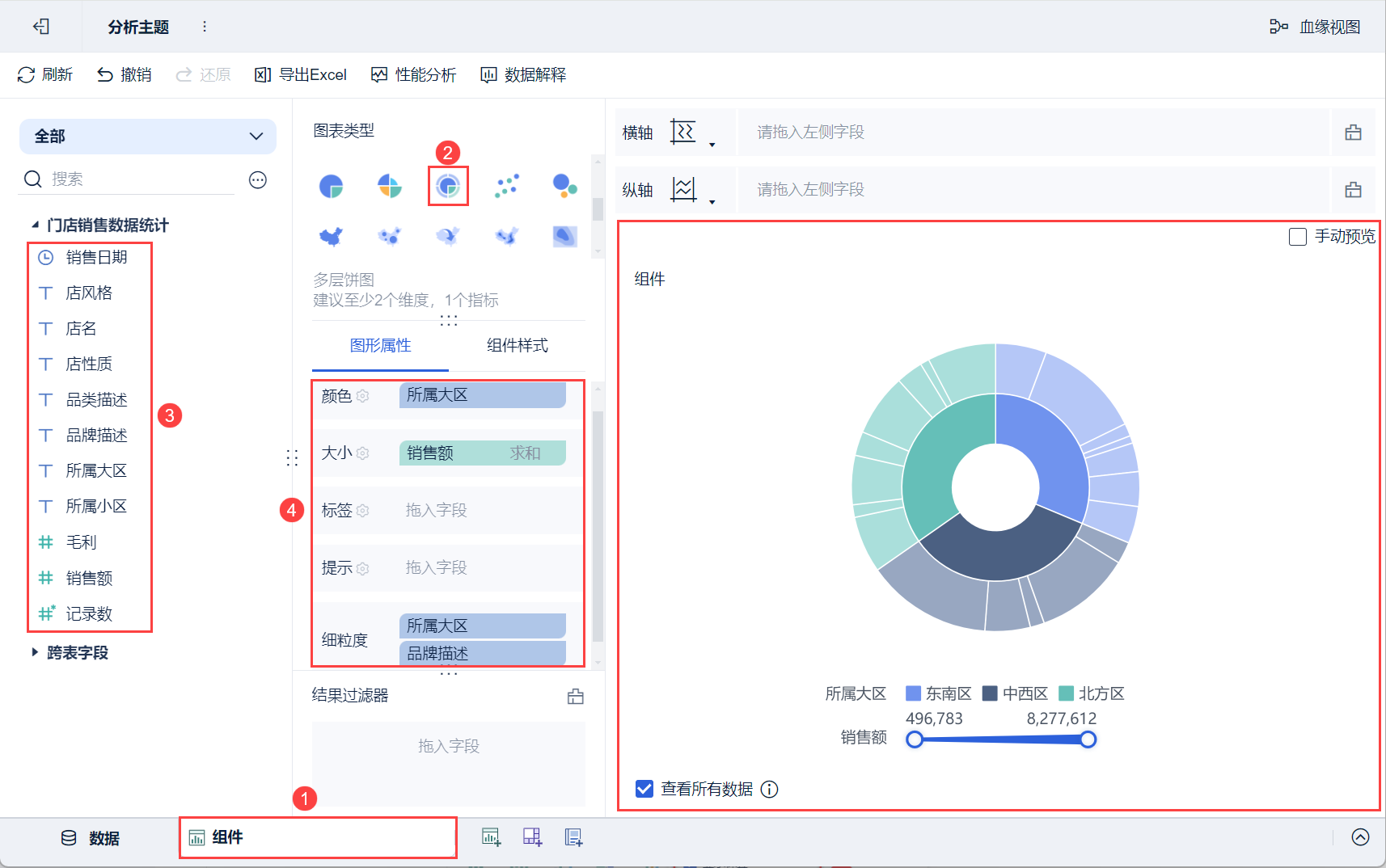 3)将左侧待分析区域的维度字段「所属大区」拖入「图形属性」下的颜色栏,「销售额」拖入大小栏,「所属大区」、「品牌描述」拖入细粒度栏,则生成一个多层饼图,内圈不同颜色的弧度分别映射每个区域的销售额,外圈浅色切块代表该区域下不同品牌的销售额,如下图所示: