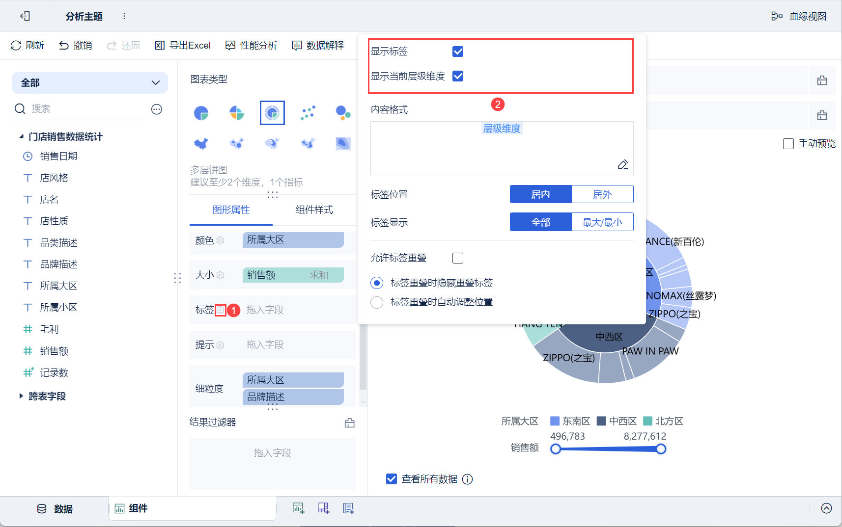 点击「图形属性」下的标签设置按钮,同时勾选「显示标签」和「显示当前层级维度」,图表则会显示当前层级对应的维度和标签,如下图所示: