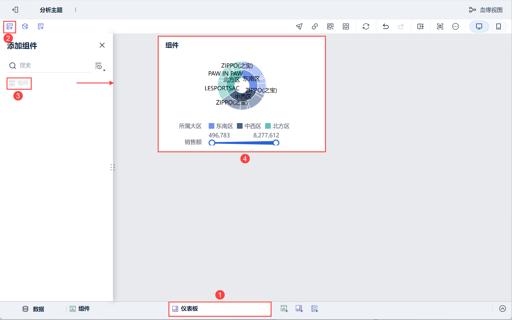 1)点击分析主题编辑界面下方添加仪表板。