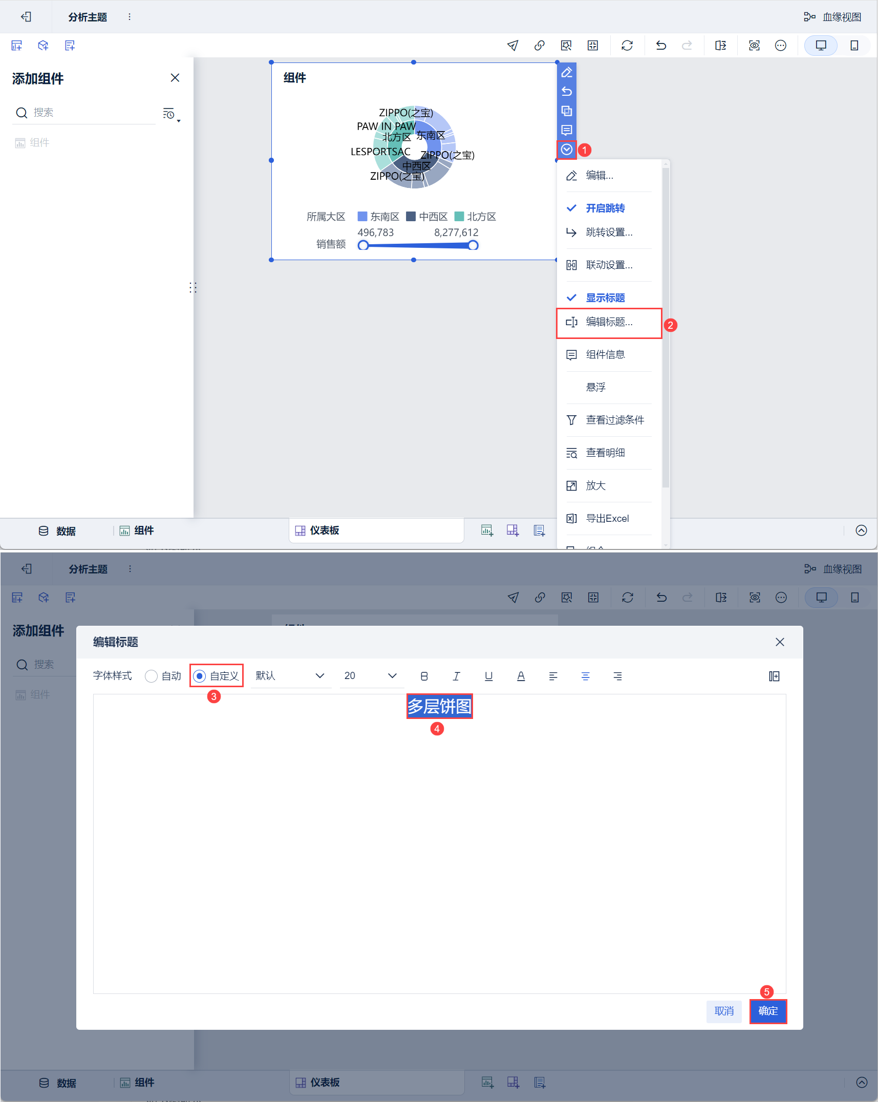 3)下拉选择「编辑标题」,样式选择「自定义」,设置标题为「多层饼图」,点击「确定」。如下图所示: